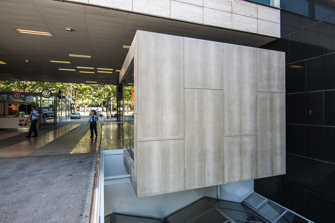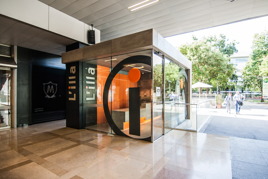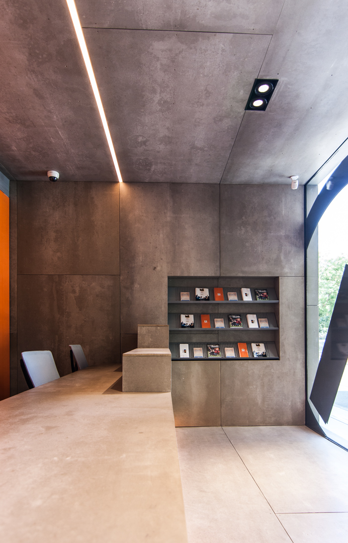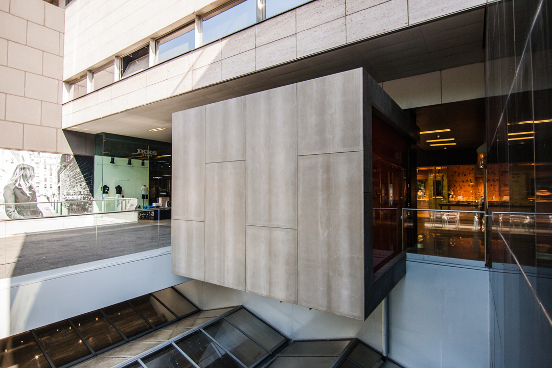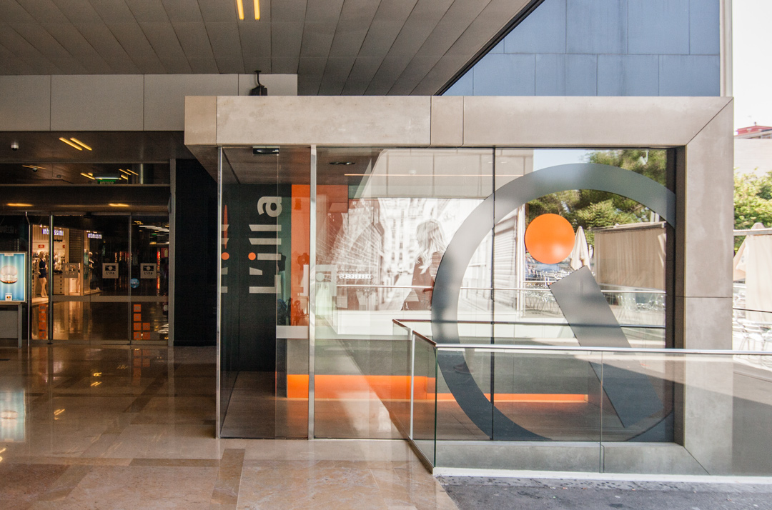 El proyecto nace de la colaboración de los arquitectos Javier Monte y Albert Lluch con Josep Ribas, Interiorista y de la necesidad del CC. “l’Illa Diagonal”, de reubicar el punto de información del Centro. Su situación, interfería en los flujos de circulación de los clientes del centro. La idea surge al apartarnos de estos flujos, y colgarnos sobre unos de los lucernarios que da a la planta inferior. Con un gesto de papiroflexia, se dobla el forjado, y lo que antes era suelo, se convierte en pared y más tarde cubierta. Ésta nueva lengua que sale del forjado necesita de una materialidad sólida, pétrea, que nos marca la elección del Viroc como aplacado en seco de la fachada. Pero el Viroc entra en el interior, y nos acaba formando estanterías y mostrador. El mostrador formalmente recuerda y se inspira skyline del mismo edificio de l’Illa.