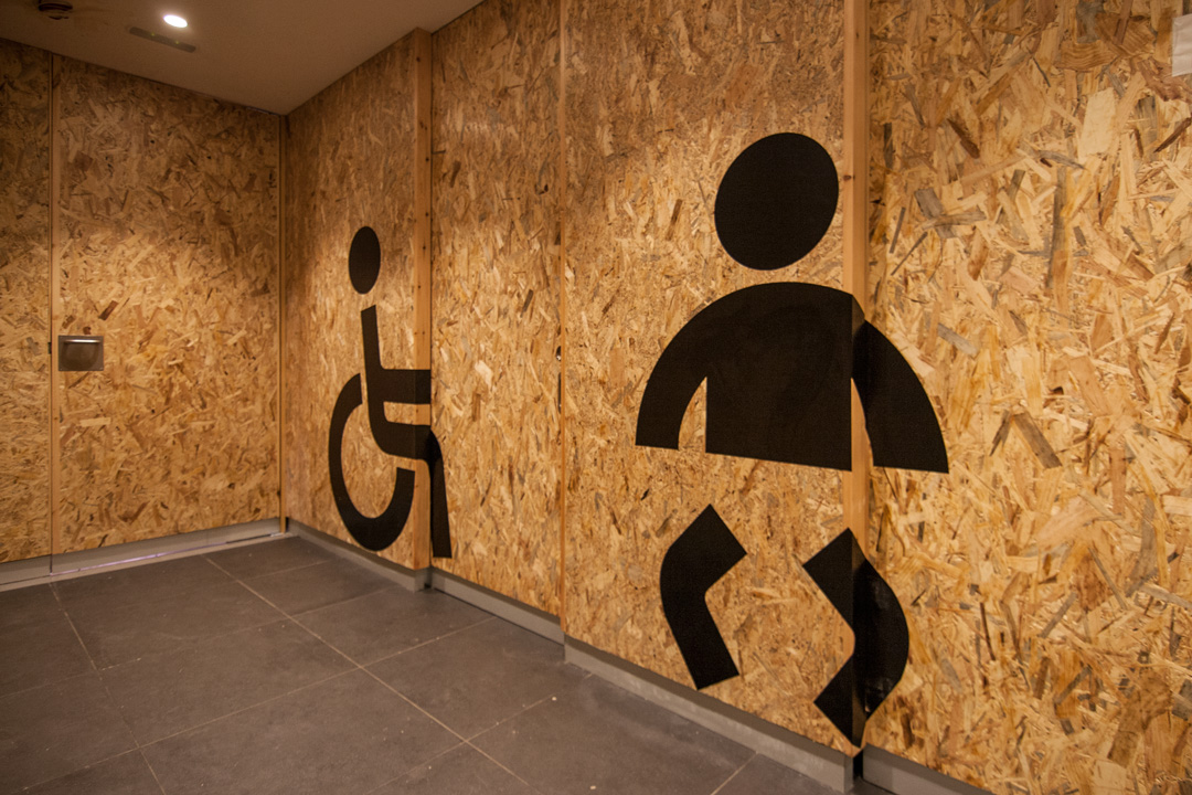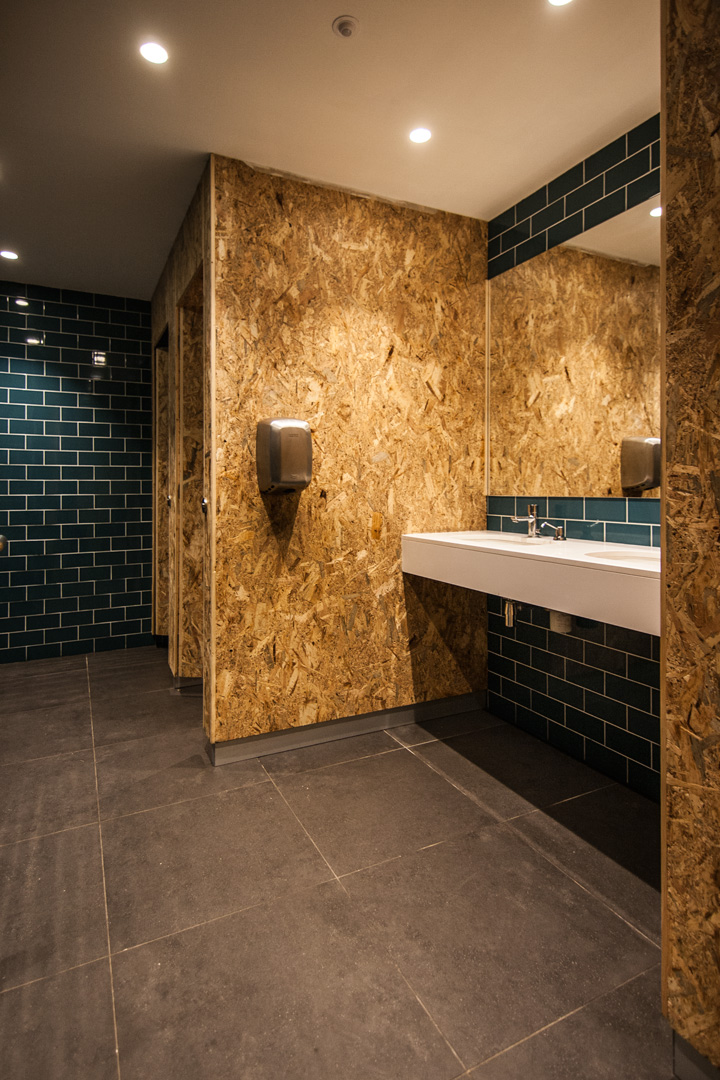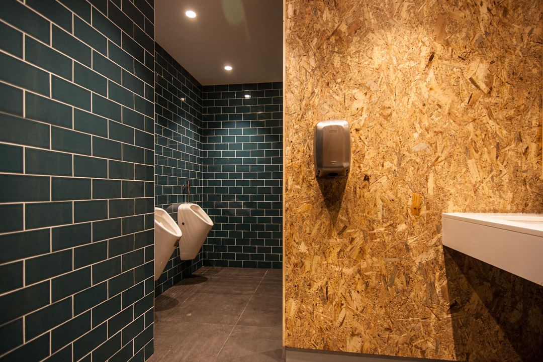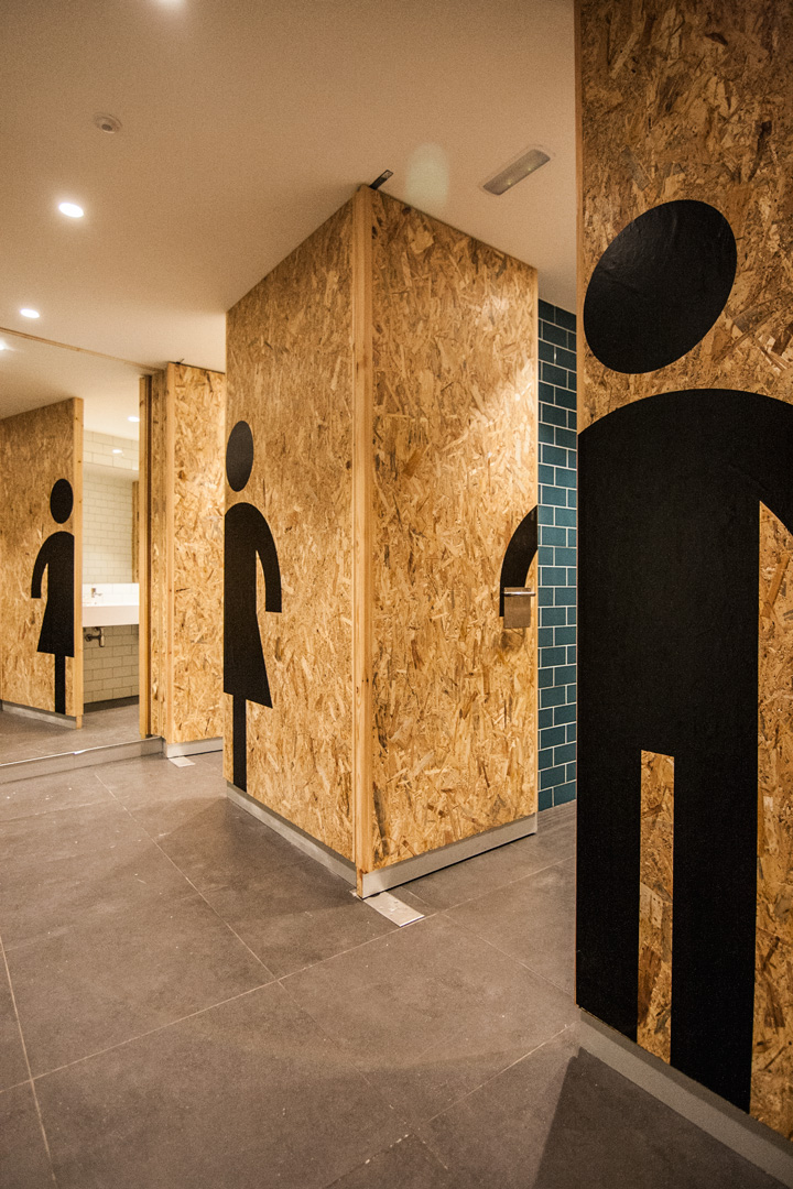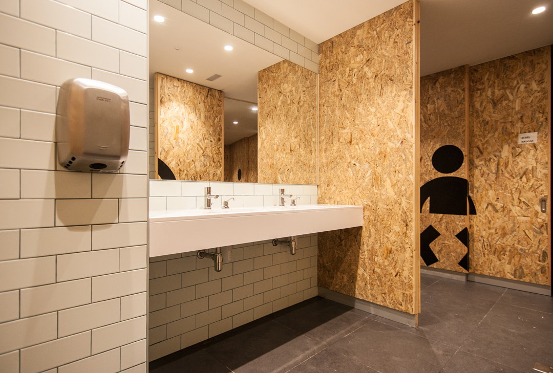 Como materiales, se eligen texturas básicas existentes, bloques de hormigón pintado, chapas de acero barnizado, paneles de madera OSB, y alicatados Johnson tiles en formato rectangular y dos tonos de color. En los baños, se intercambian los colores entre azulejos y borada, en el de hombres el azulejo es azul con borada blanca, y en el de señoras el azulejo de color blanco con la borada azul. Como divisorias y revestimientos, se eligen paneles OSB barnizados con estructura de pino interior, y rodapiés de aluminio o acero según el nivel de humedad de cada zona. Un detalle importante, cambiar las barandillas existentes por unas de vidrio para quitar peso visual al conjunto.