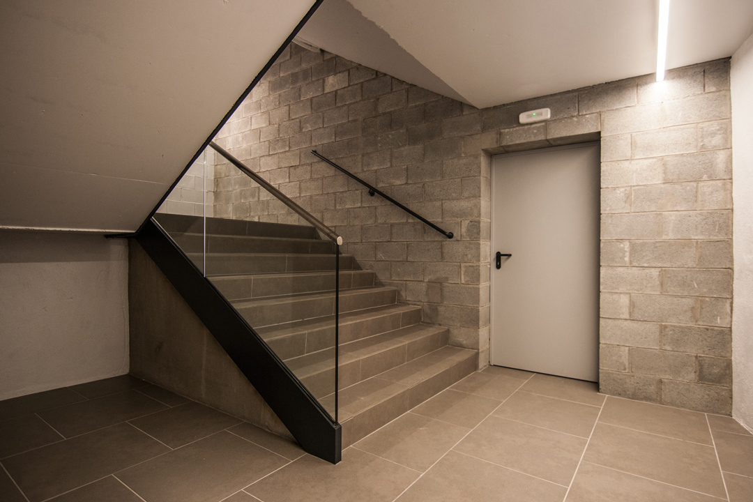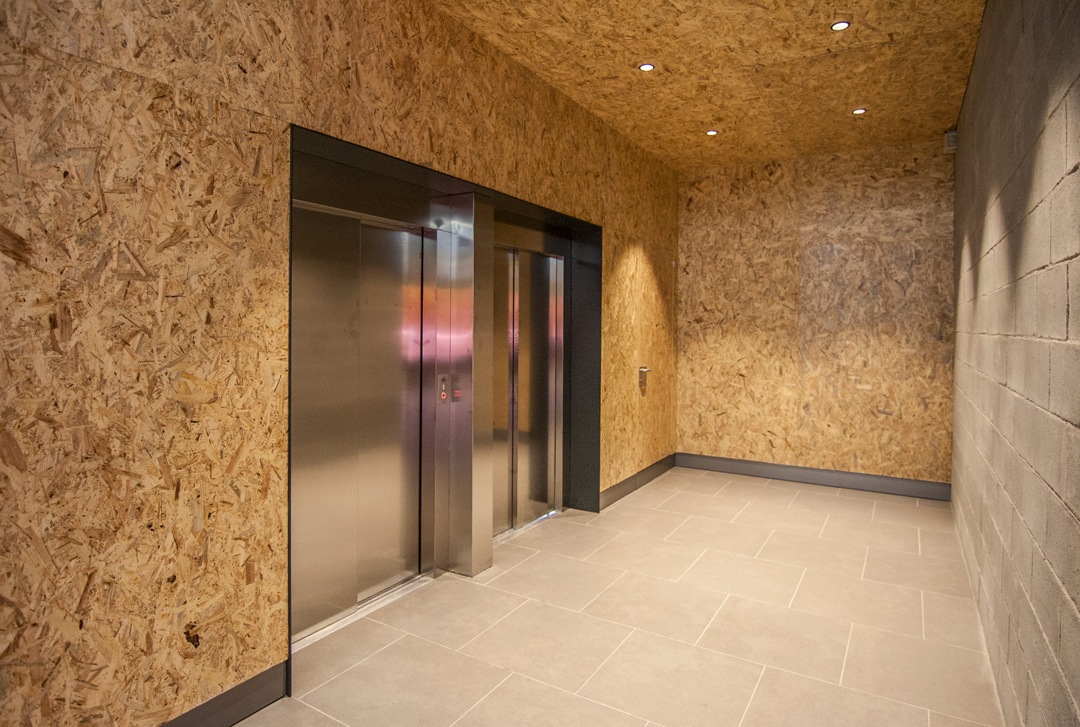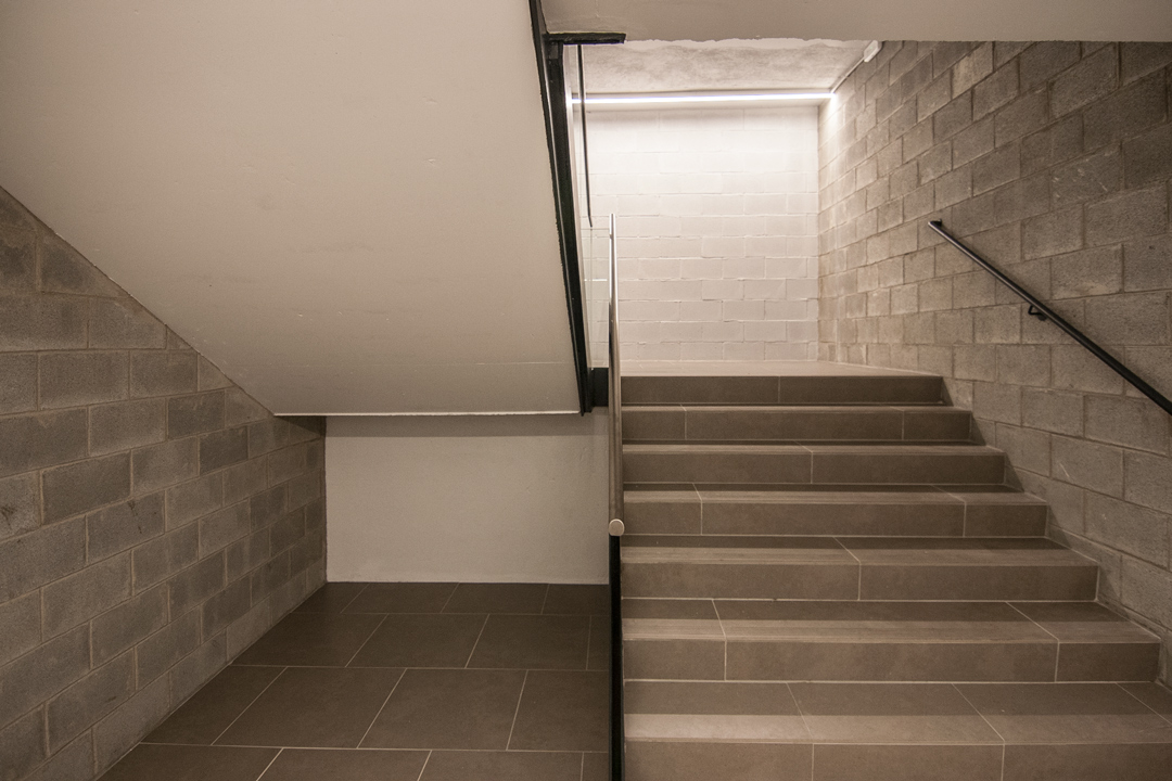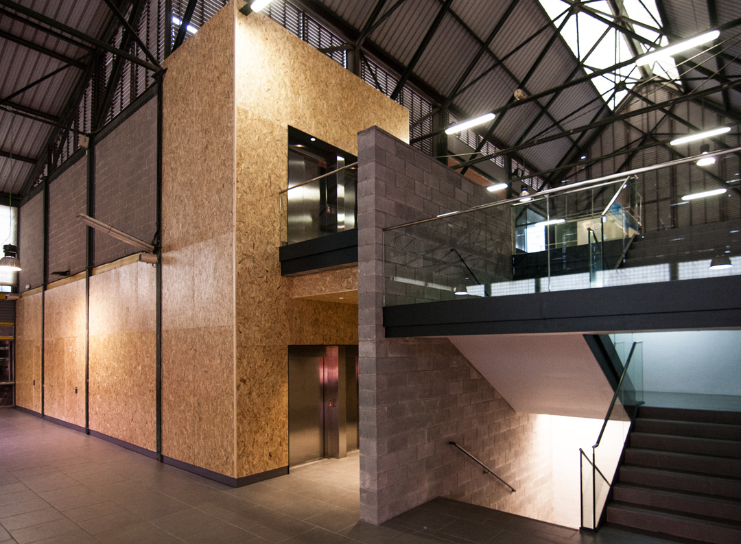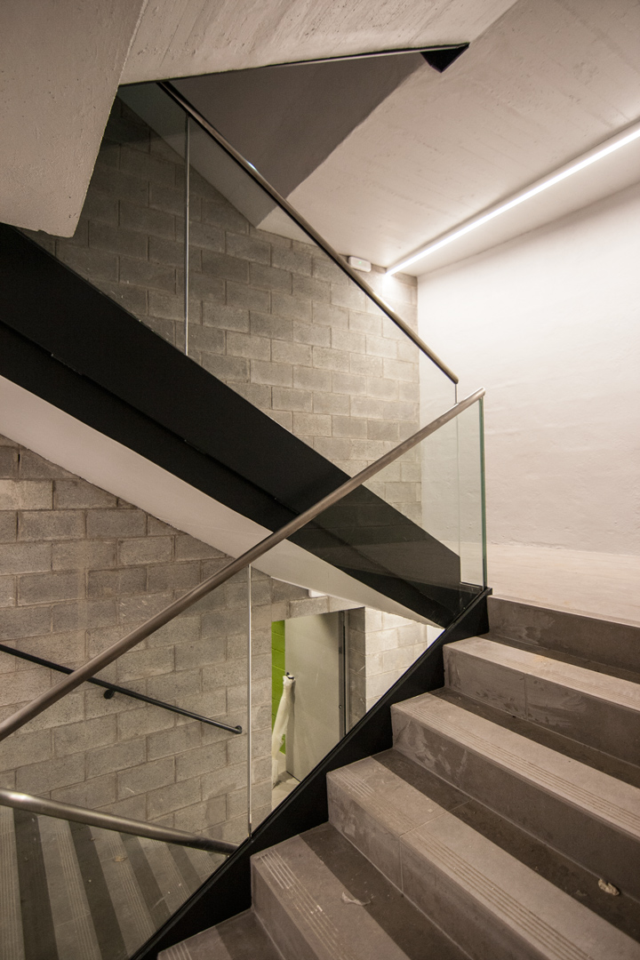 Como materiales, se eligen texturas básicas existentes, bloques de hormigón pintado, chapas de acero barnizado, paneles de madera OSB, y alicatados Johnson tiles en formato rectangular y dos tonos de color. En los baños, se intercambian los colores entre azulejos y borada, en el de hombres el azulejo es azul con borada blanca, y en el de señoras el azulejo de color blanco con la borada azul. Como divisorias y revestimientos, se eligen paneles OSB barnizados con estructura de pino interior, y rodapiés de aluminio o acero según el nivel de humedad de cada zona. Un detalle importante, cambiar las barandillas existentes por unas de vidrio para quitar peso visual al conjunto.