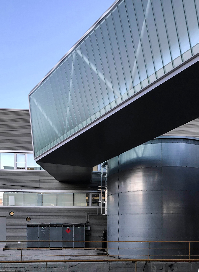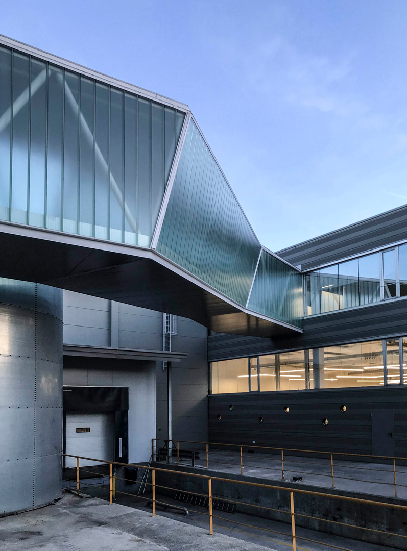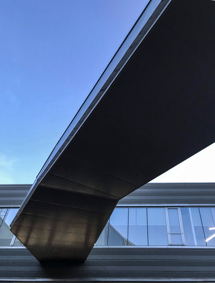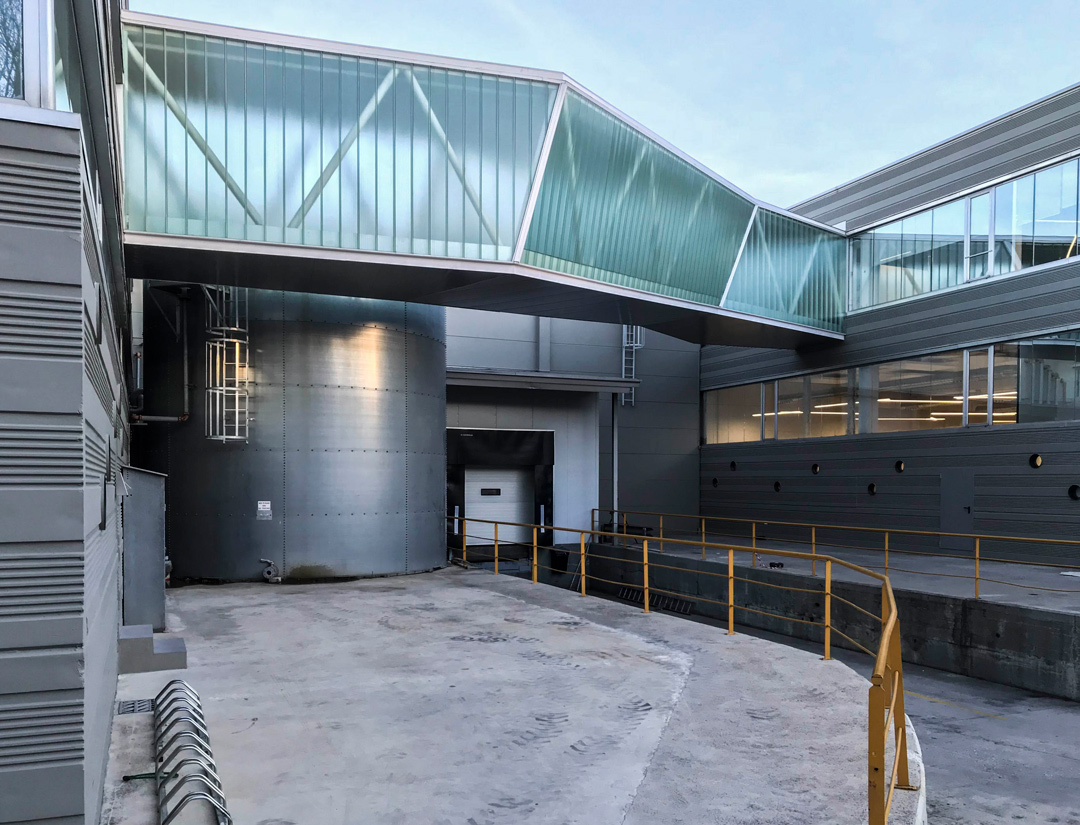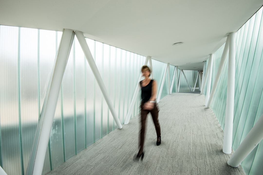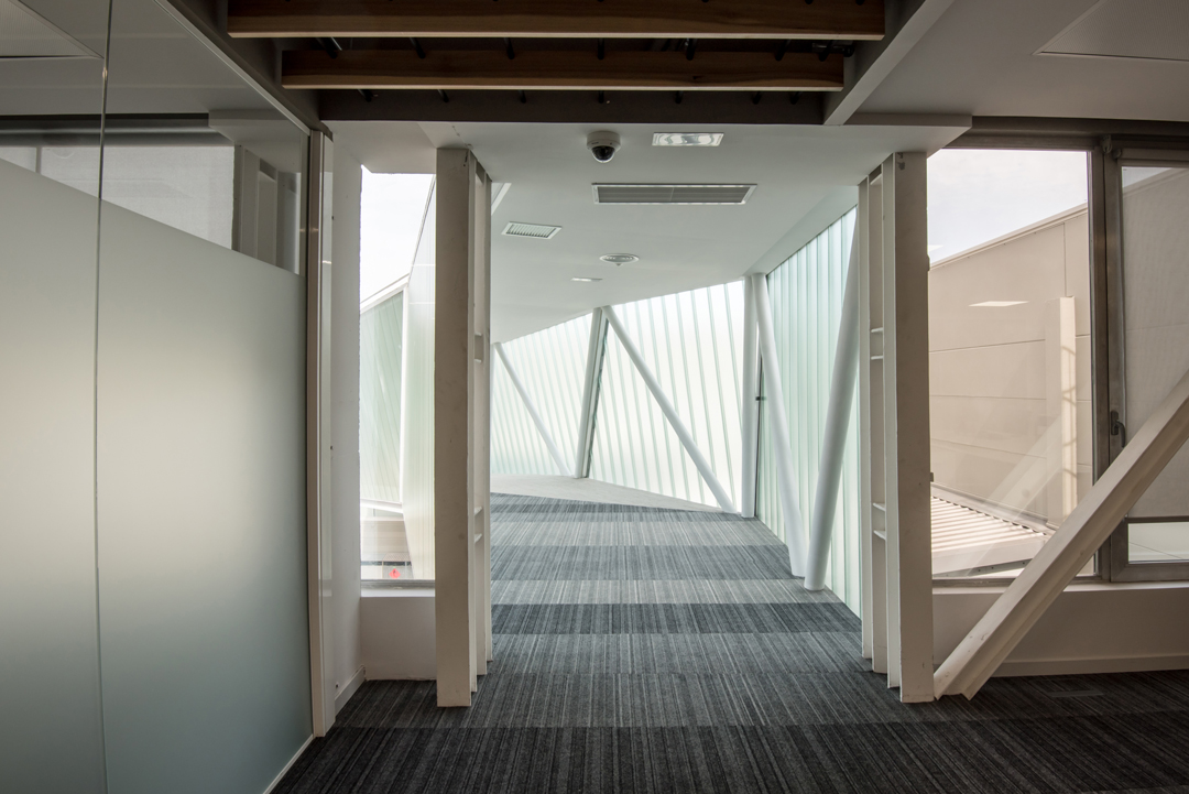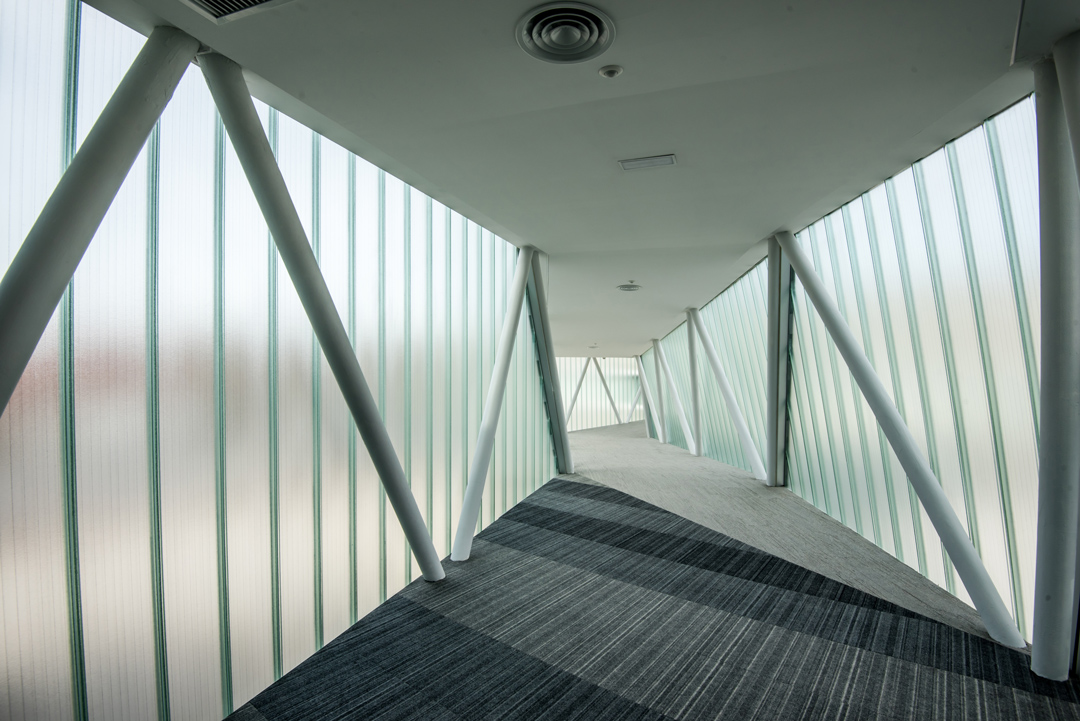 Pasarela de conexión entre las dos áreas de oficinas de una misma empresa, situadas en el primer piso de dos edificaciones sin conexión real, que debe salvar el muelle de carga y descarga, y el depósito de agua del sistema antincendios. La dificultad ha sido que las dos oficinas, estaban a diferente cota, y el punto de conexión ideal está desplazado. El resultado es una pasarela con pendiente, y que zigzaguea en el espacio con muros de U-Glass que por la noche se iluminan, y generan un verdadero cordón umbilical de luz.
