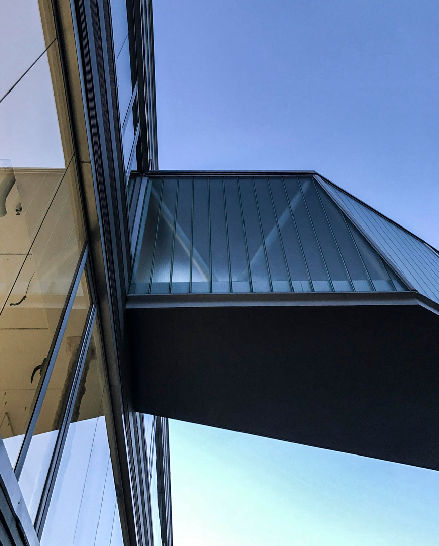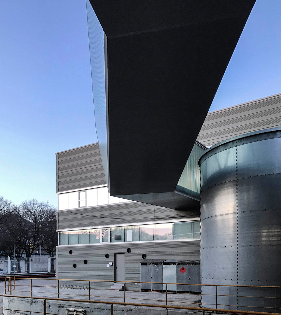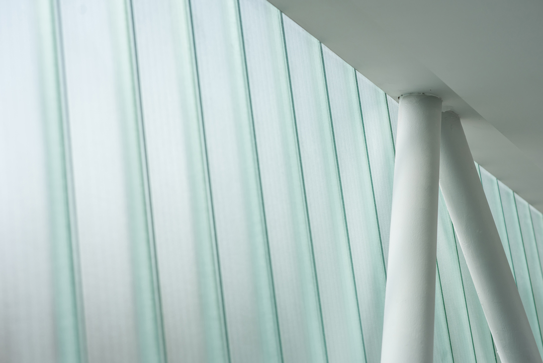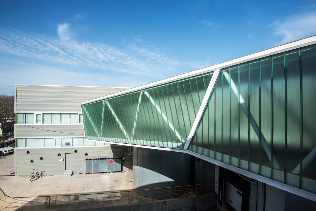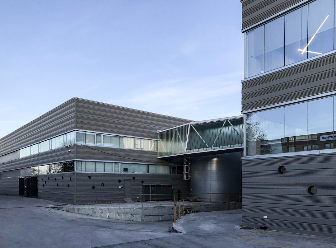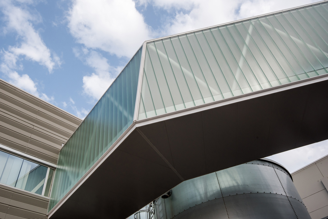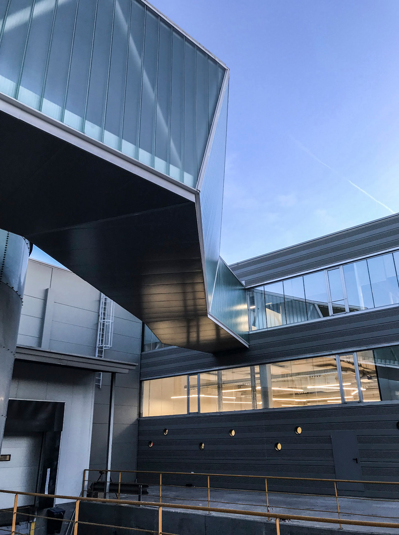 Pasarela de conexión entre las dos áreas de oficinas de una misma empresa, situadas en el primer piso de dos edificaciones sin conexión real, que debe salvar el muelle de carga y descarga, y el depósito de agua del sistema antincendios. La dificultad ha sido que las dos oficinas, estaban a diferente cota, y el punto de conexión ideal está desplazado. El resultado es una pasarela con pendiente, y que zigzaguea en el espacio con muros de U-Glass que por la noche se iluminan, y generan un verdadero cordón umbilical de luz.