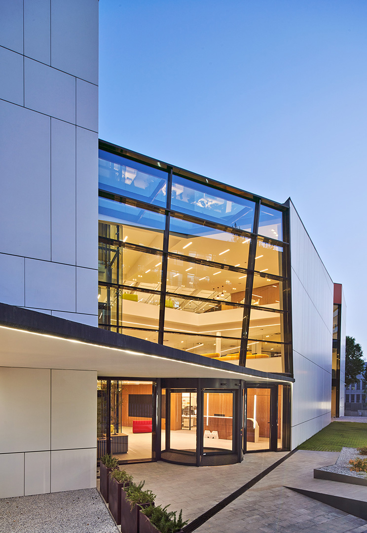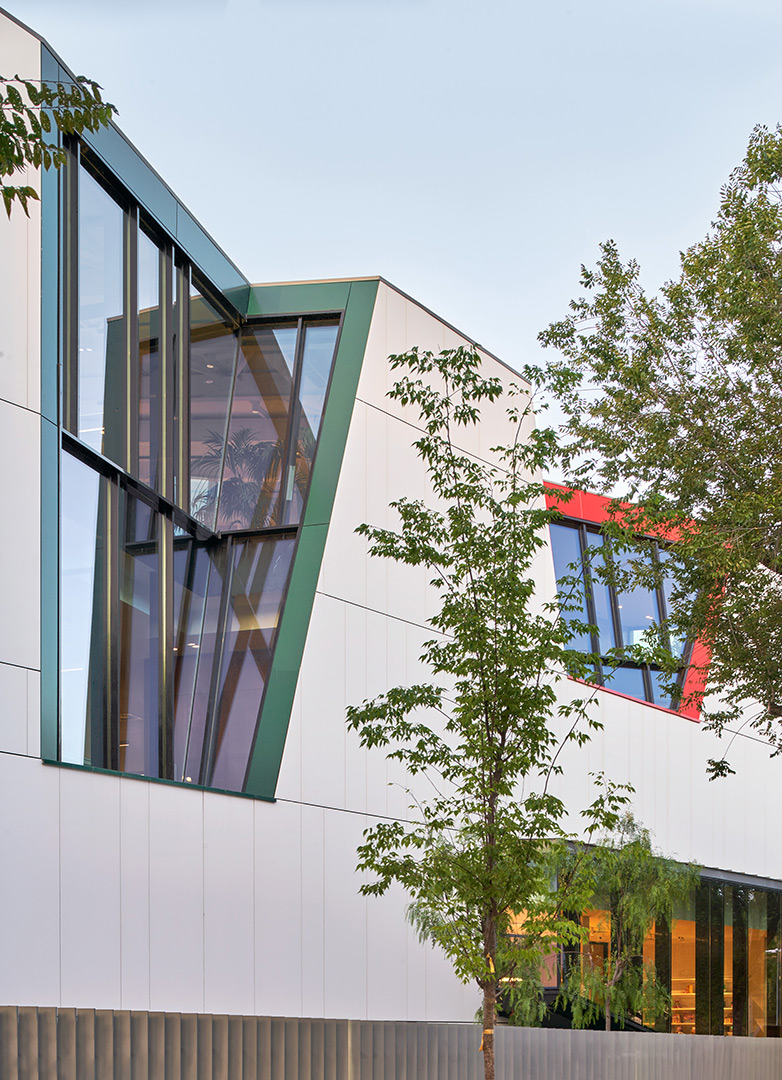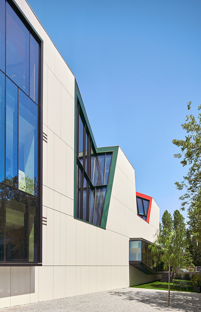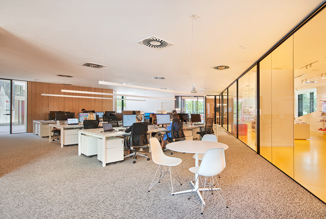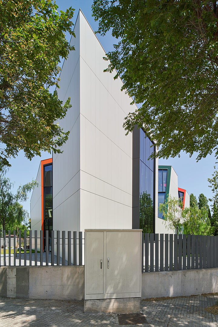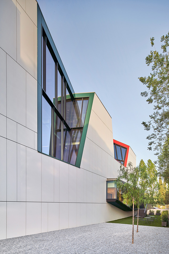 Es el último proyecto en colaboración con OMA arquitectos, pero uno de los más ilusionantes, ya que siempre hace ilusión proyectar la sede corporativa de una empresa de juguetes, con los que juegan tus hijos. Es la oportunidad de devolverles el favor. La idea original era clara, aprovechar al máximo la forma triangular de la parcela, creando un monolito sin ventanas, pero que, a través de mordiscos en la piel, nos permitiese la entrada de luz por todas sus caras. A consecuencia de los mordiscos, aparecían los colores corporativos de MagicBox, el rojo, naranja y verde. La estructura del edificio es sumamente compleja, ya que evitamos al máximo la colocación de pilares interiores. Suficiente teníamos con la forma angulada de las plantas.