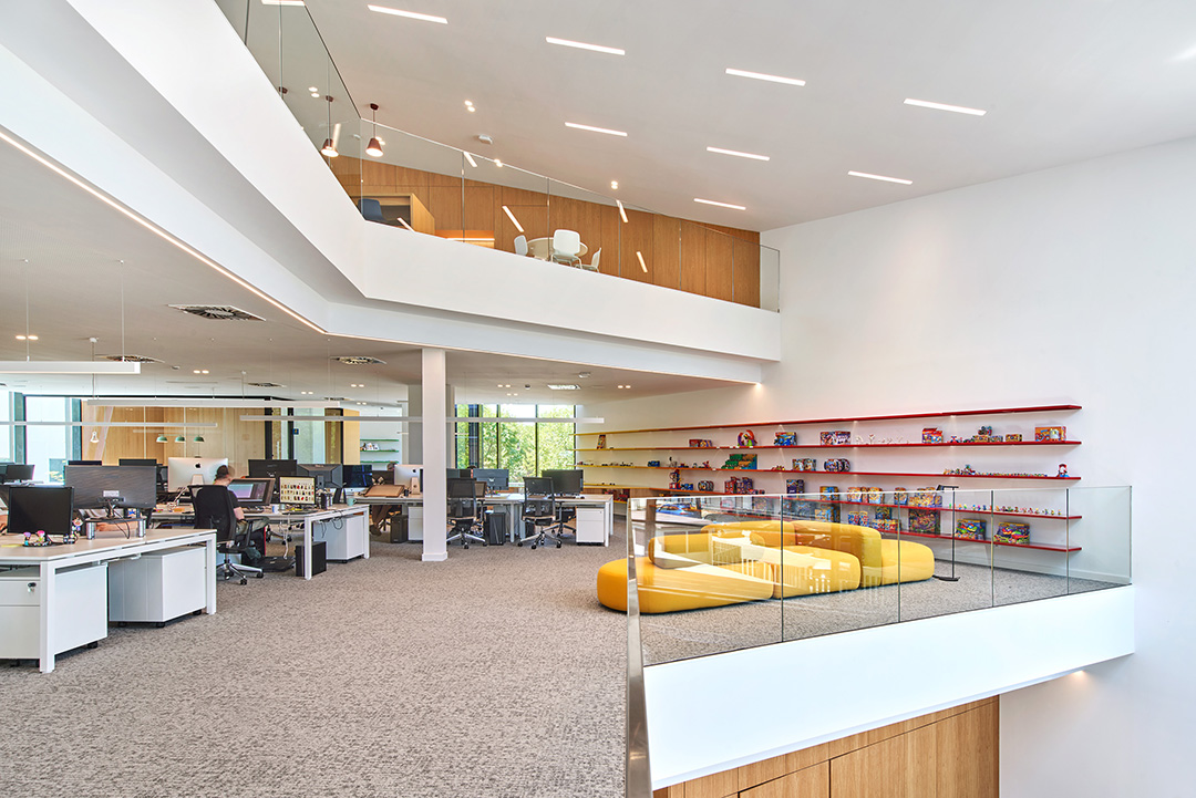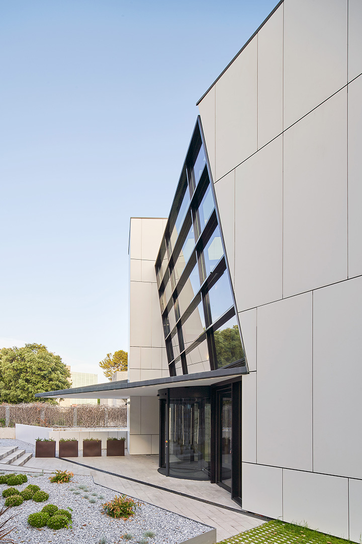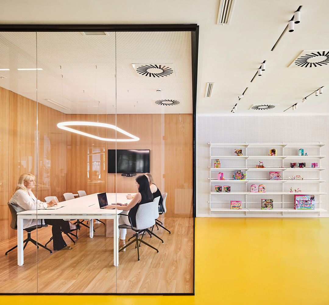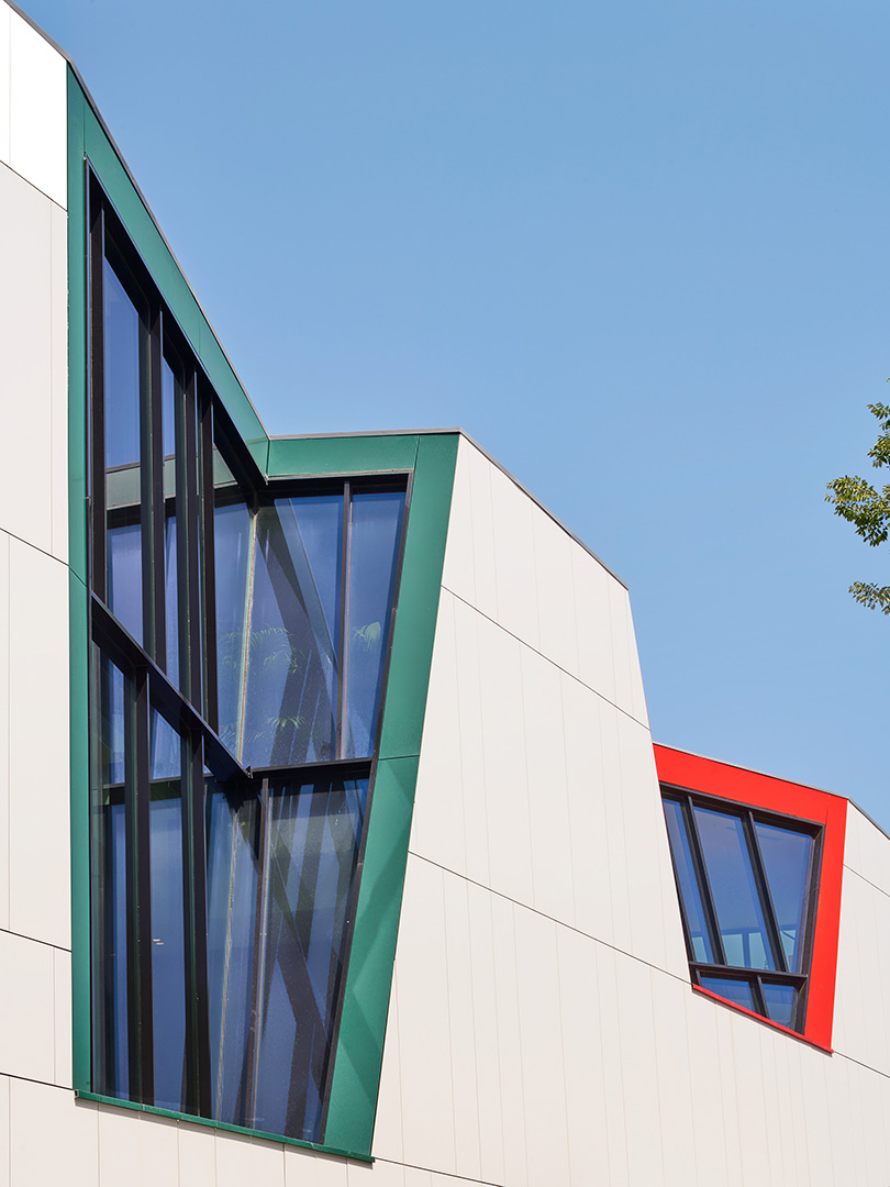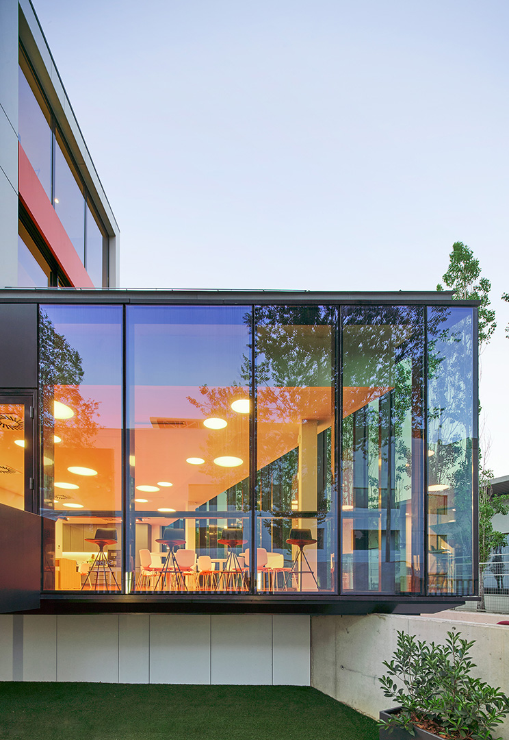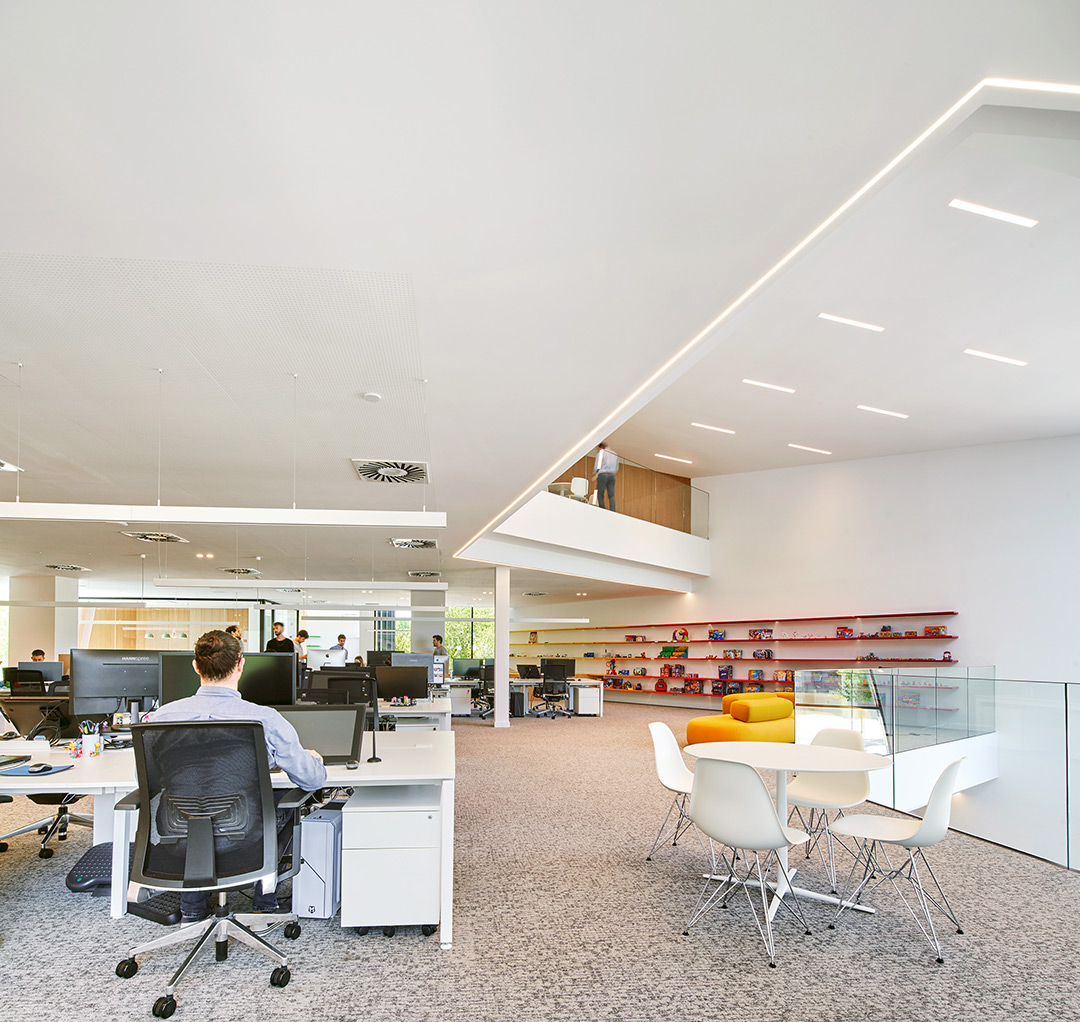 Es el último proyecto en colaboración con OMA arquitectos, pero uno de los más ilusionantes, ya que siempre hace ilusión proyectar la sede corporativa de una empresa de juguetes, con los que juegan tus hijos. Es la oportunidad de devolverles el favor. La idea original era clara, aprovechar al máximo la forma triangular de la parcela, creando un monolito sin ventanas, pero que, a través de mordiscos en la piel, nos permitiese la entrada de luz por todas sus caras. A consecuencia de los mordiscos, aparecían los colores corporativos de MagicBox, el rojo, naranja y verde. La estructura del edificio es sumamente compleja, ya que evitamos al máximo la colocación de pilares interiores. Suficiente teníamos con la forma angulada de las plantas.