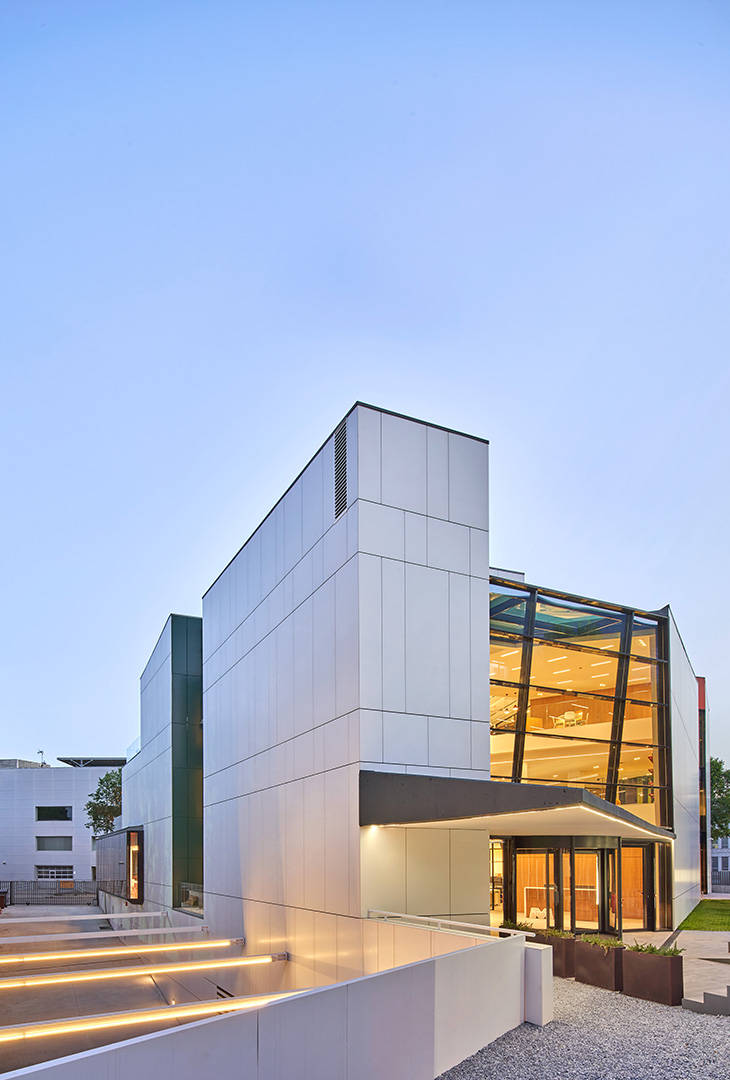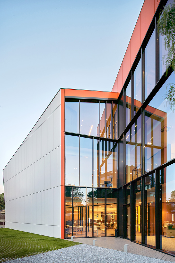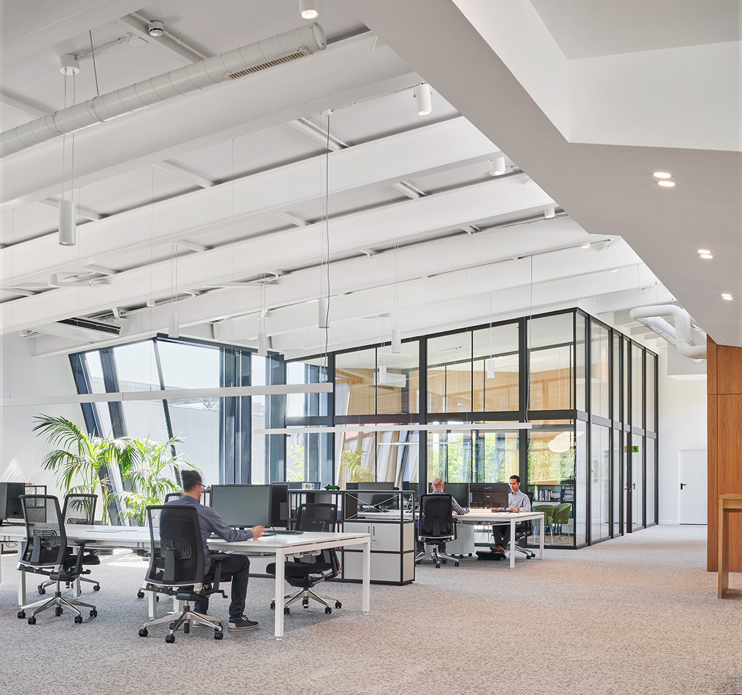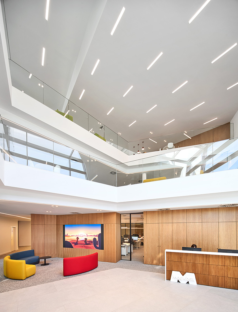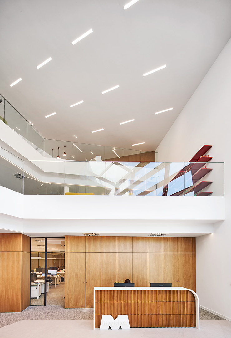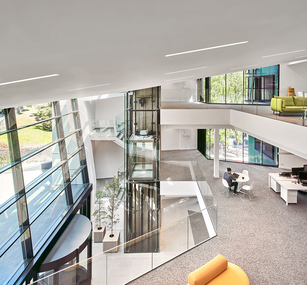 Es el último proyecto en colaboración con OMA arquitectos, pero uno de los más ilusionantes, ya que siempre hace ilusión proyectar la sede corporativa de una empresa de juguetes, con los que juegan tus hijos. Es la oportunidad de devolverles el favor. La idea original era clara, aprovechar al máximo la forma triangular de la parcela, creando un monolito sin ventanas, pero que, a través de mordiscos en la piel, nos permitiese la entrada de luz por todas sus caras. A consecuencia de los mordiscos, aparecían los colores corporativos de MagicBox, el rojo, naranja y verde. La estructura del edificio es sumamente compleja, ya que evitamos al máximo la colocación de pilares interiores. Suficiente teníamos con la forma angulada de las plantas.
