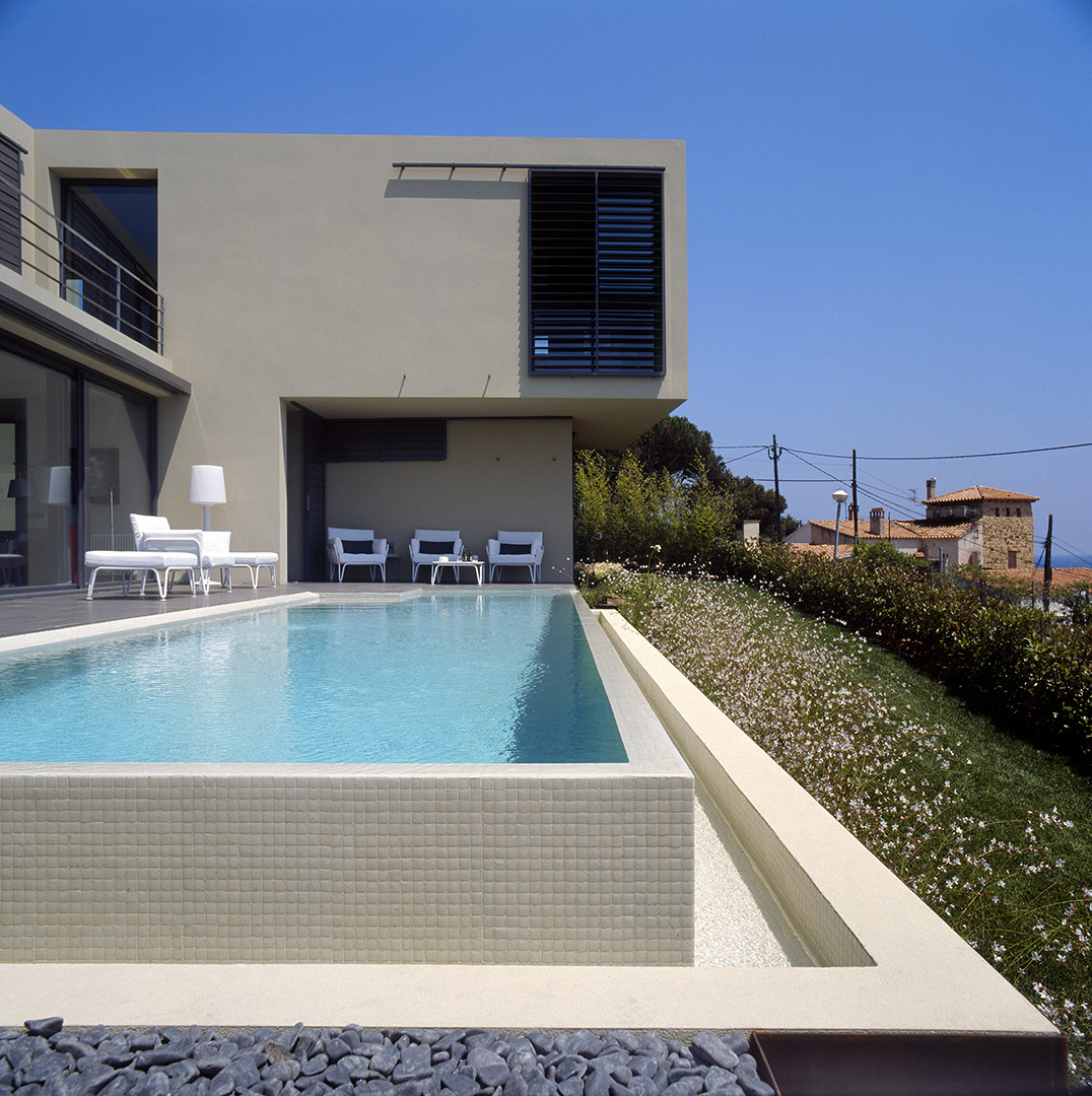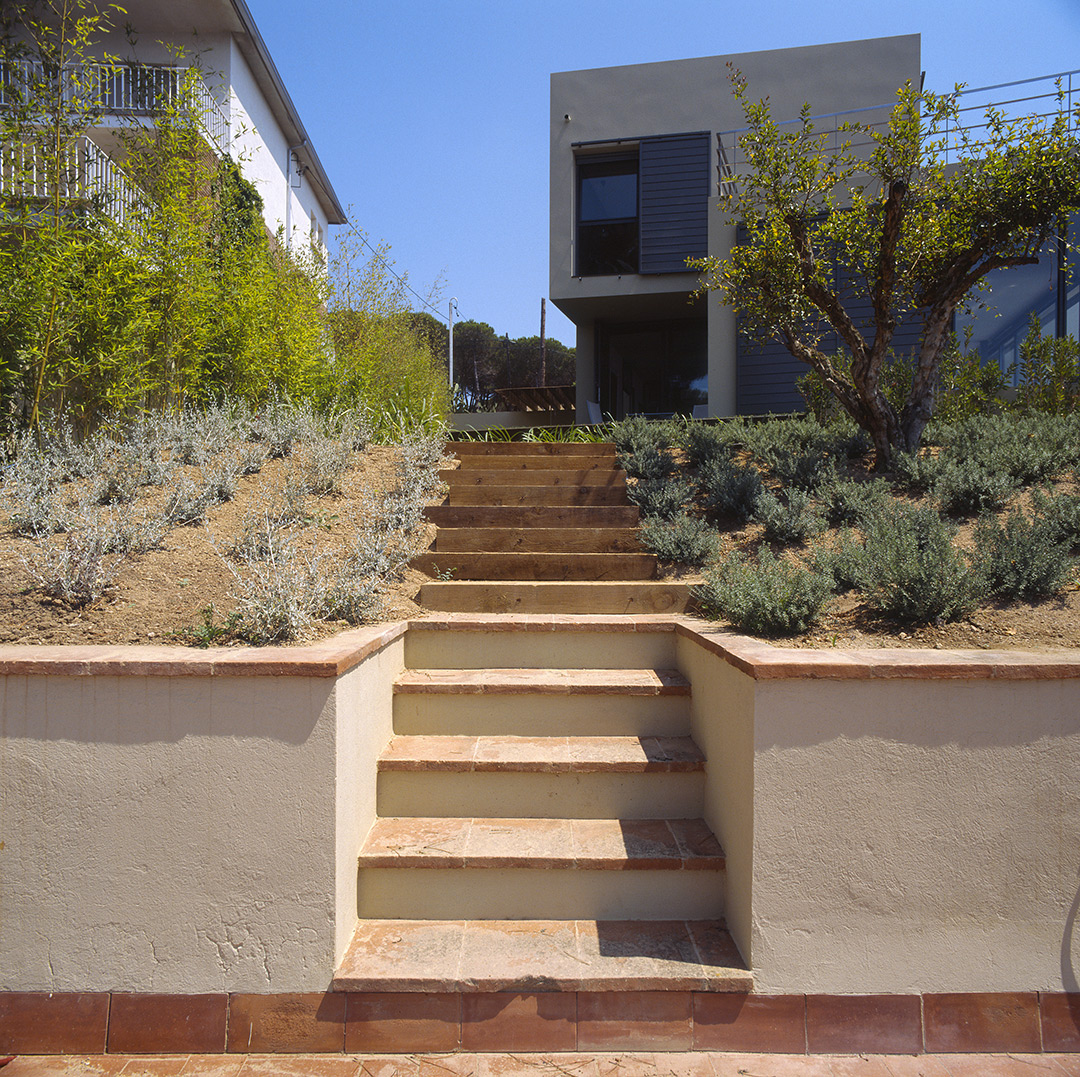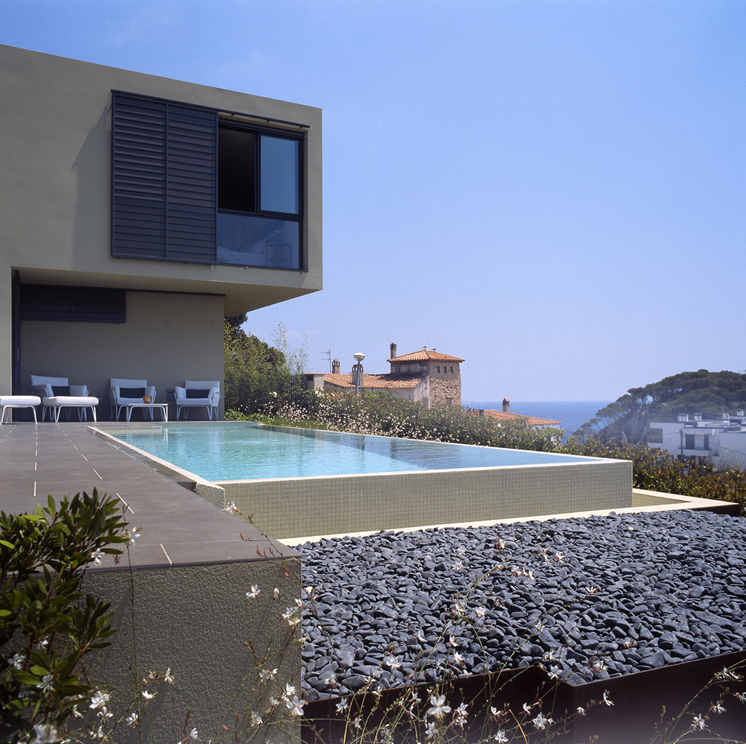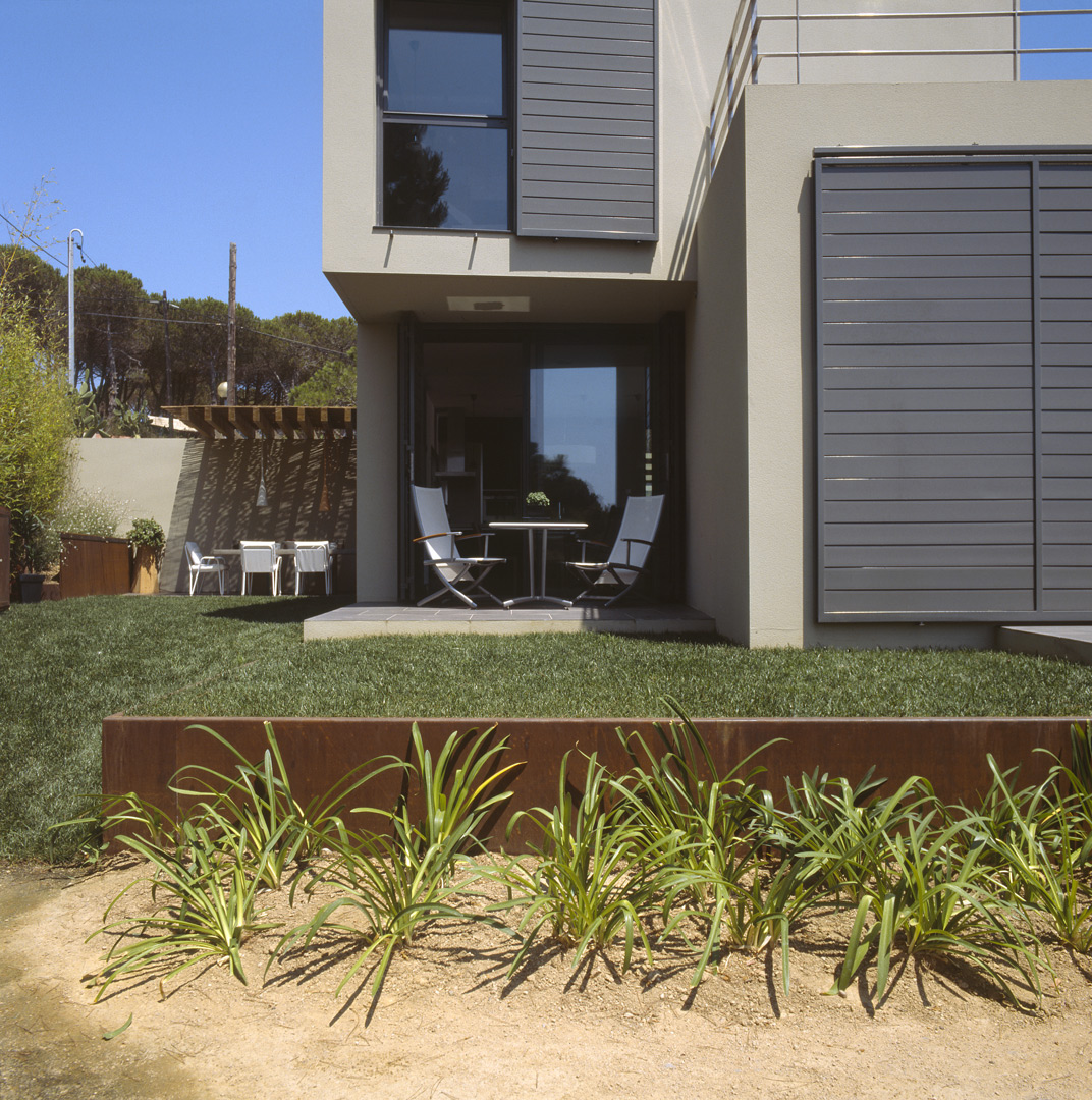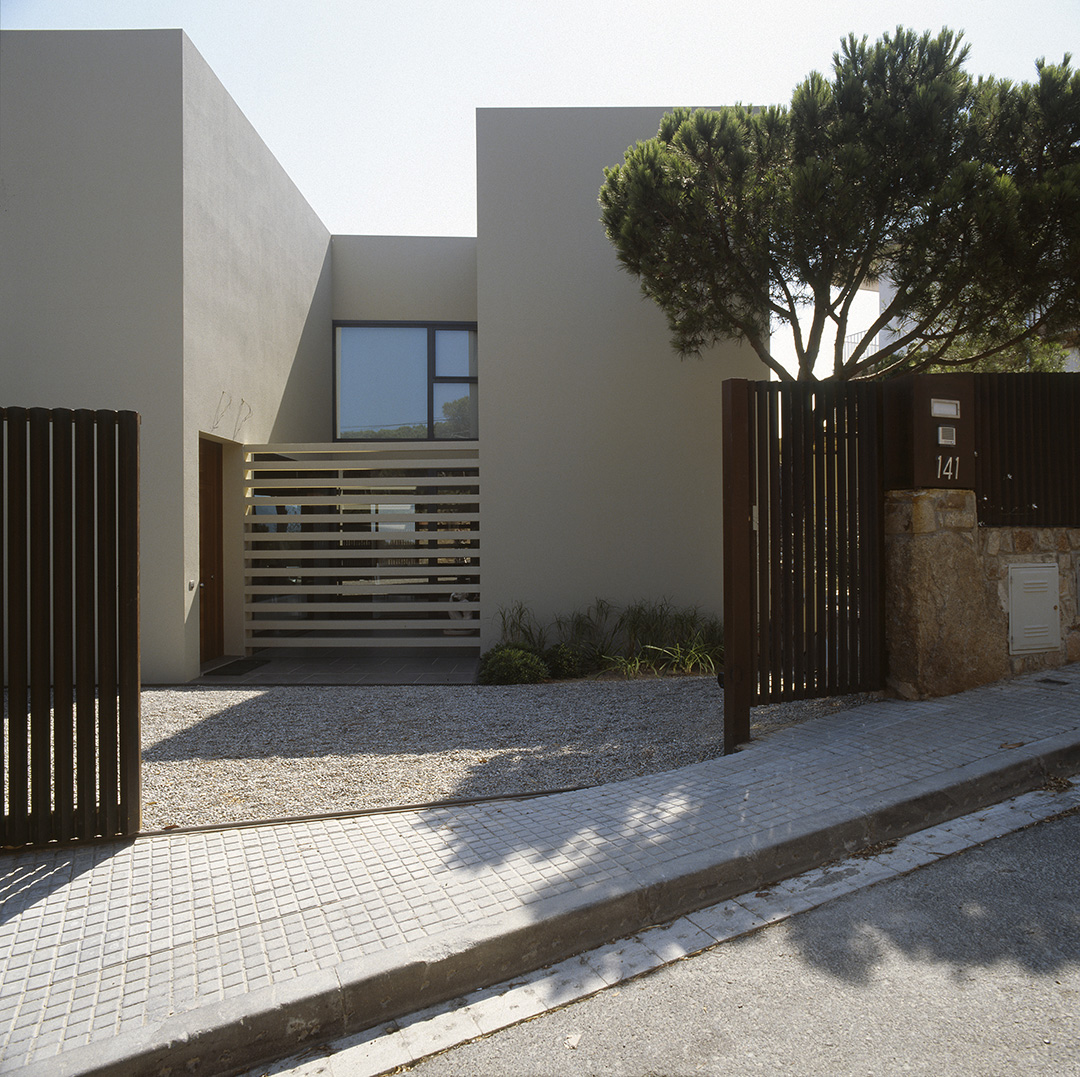 Aunque no lo parezca en principio, este proyecto es una reforma de una vivienda existente. En el momento en que se cursó el permiso, no se otorgaban licencias de obras para viviendas de nueva planta, y el proyecto se tuvo que adaptar a una vivienda existente, de la cual se aprovecharon solamente cuatro muros y todo el volumen del garaje; elemento que estaba fuera de la distancia mínima a vial, y se hubiera tenido que derruir. Todo el proyecto gira sobre el cuerpo donde se encuentra la escalera, y el patio contiguo a este. De ahí, se accede en la planta baja a la zona de día y a la habitación de servicio respectivamente; y en la planta superior a las dos únicas habitaciones, con sus baños respectivos. La zona de día, está compuesta por un salón-comedor con la cocina abierta, con aberturas en sus cuatro fachadas, y un pequeño despensa y lavadero. Mediante grandes aberturas, se aprovechó las vistas privilegiadas sobre el mar, y en planta baja, las continuas conexiones con el exterior.