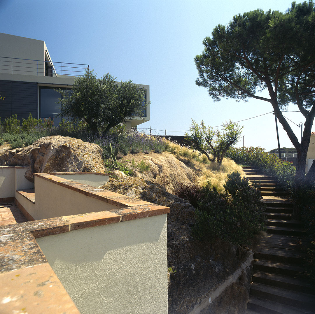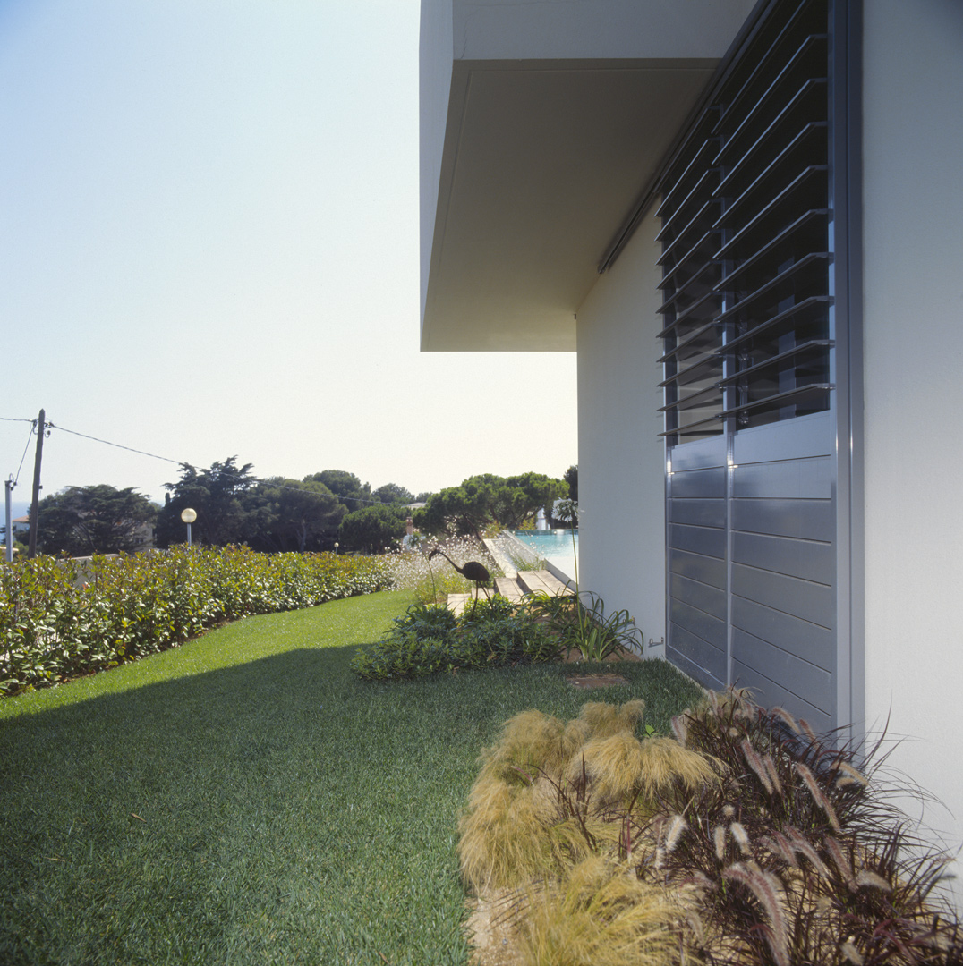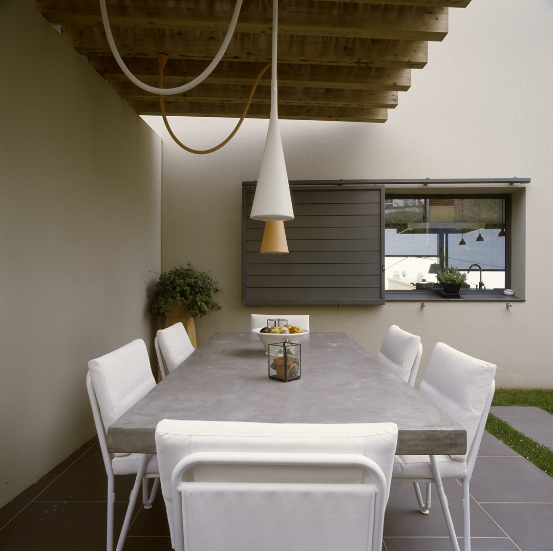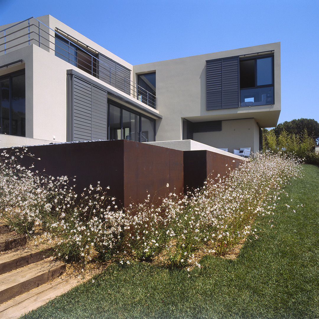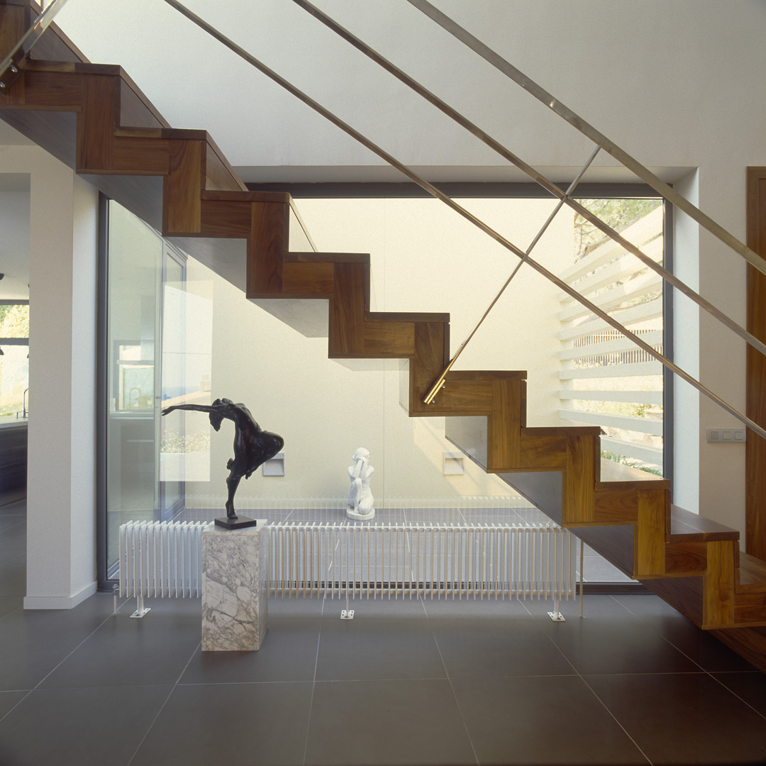 Aunque no lo parezca en principio, este proyecto es una reforma de una vivienda existente. En el momento en que se cursó el permiso, no se otorgaban licencias de obras para viviendas de nueva planta, y el proyecto se tuvo que adaptar a una vivienda existente, de la cual se aprovecharon solamente cuatro muros y todo el volumen del garaje; elemento que estaba fuera de la distancia mínima a vial, y se hubiera tenido que derruir. Todo el proyecto gira sobre el cuerpo donde se encuentra la escalera, y el patio contiguo a este. De ahí, se accede en la planta baja a la zona de día y a la habitación de servicio respectivamente; y en la planta superior a las dos únicas habitaciones, con sus baños respectivos. La zona de día, está compuesta por un salón-comedor con la cocina abierta, con aberturas en sus cuatro fachadas, y un pequeño despensa y lavadero. Mediante grandes aberturas, se aprovechó las vistas privilegiadas sobre el mar, y en planta baja, las continuas conexiones con el exterior.