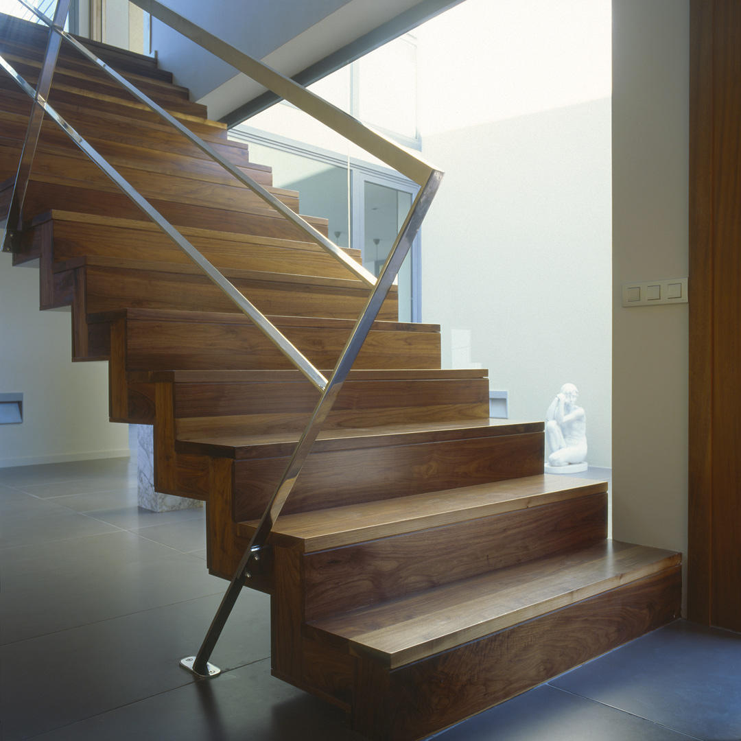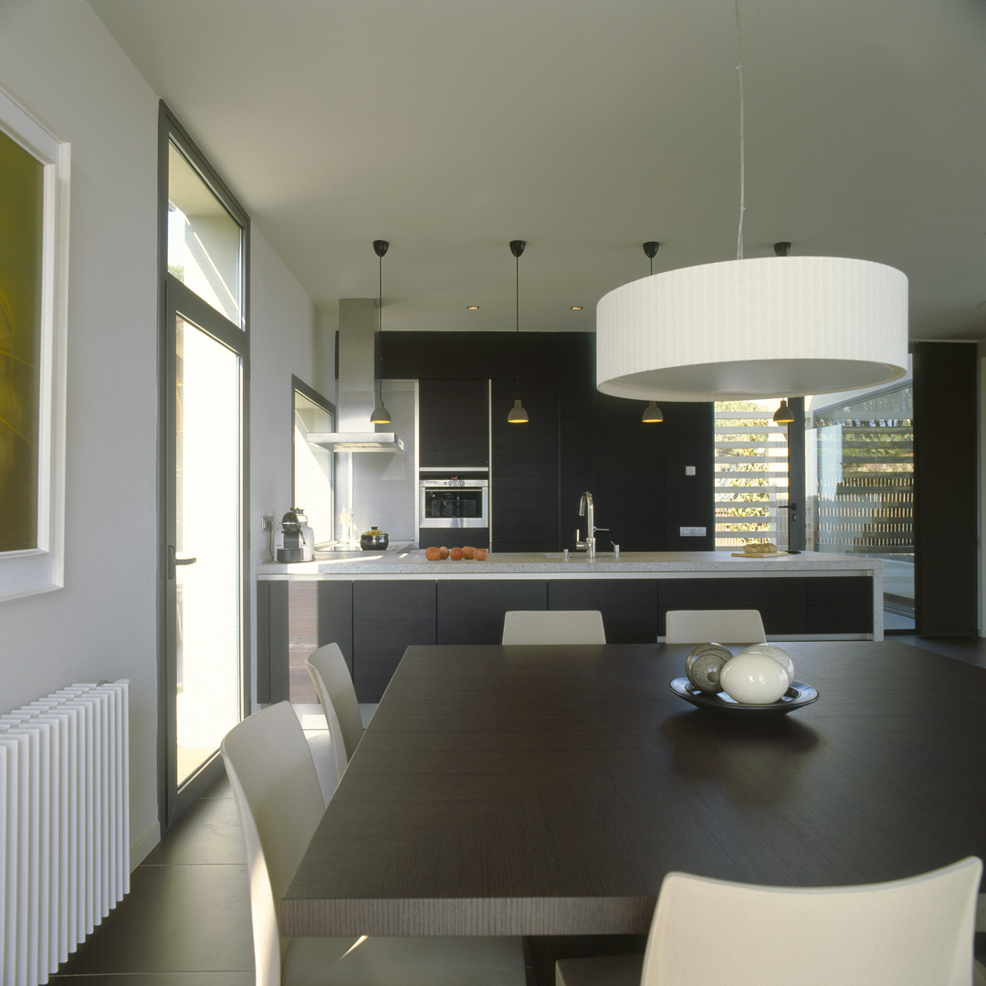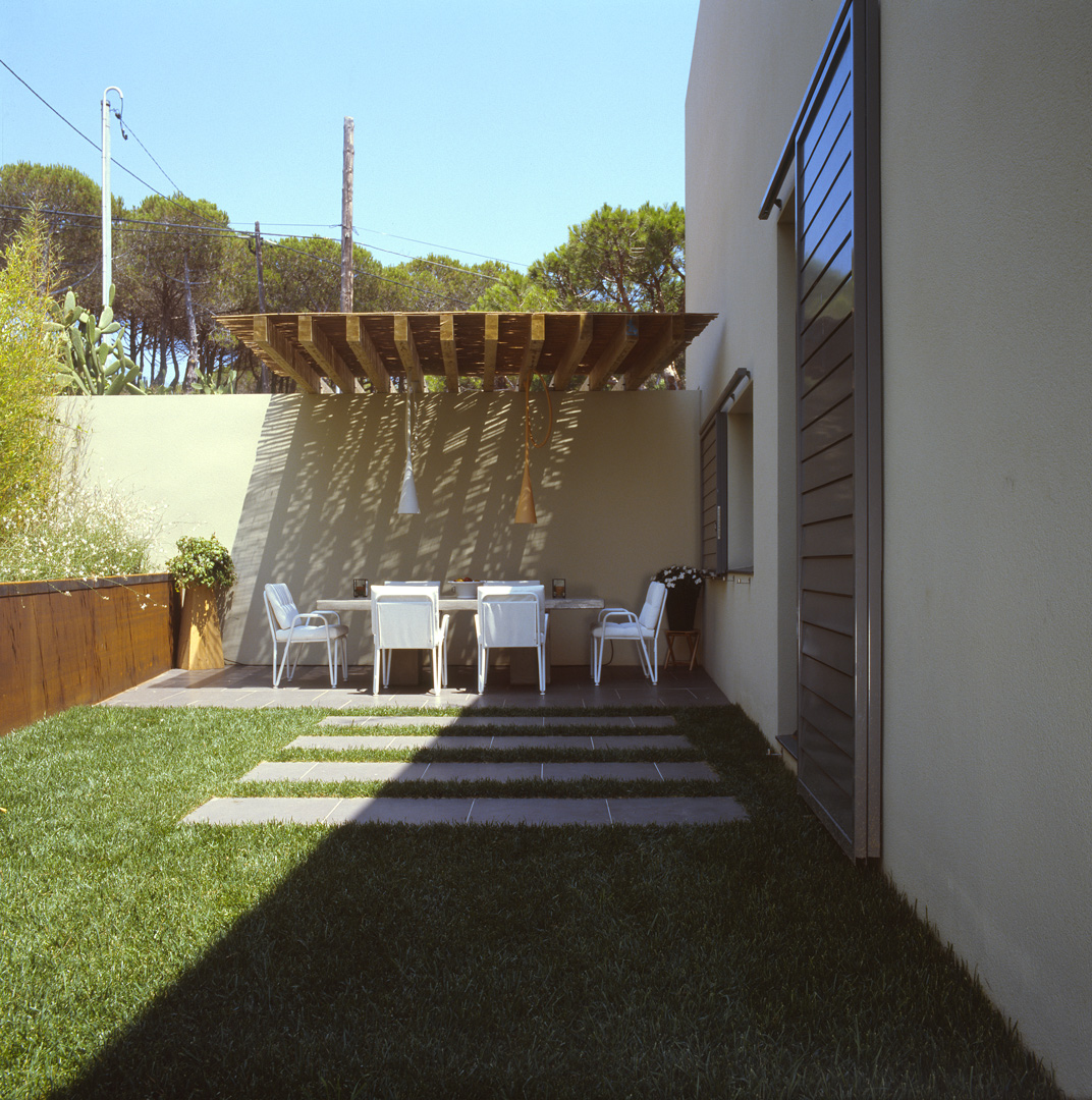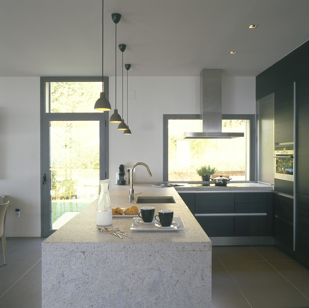 Aunque no lo parezca en principio, este proyecto es una reforma de una vivienda existente. En el momento en que se cursó el permiso, no se otorgaban licencias de obras para viviendas de nueva planta, y el proyecto se tuvo que adaptar a una vivienda existente, de la cual se aprovecharon solamente cuatro muros y todo el volumen del garaje; elemento que estaba fuera de la distancia mínima a vial, y se hubiera tenido que derruir. Todo el proyecto gira sobre el cuerpo donde se encuentra la escalera, y el patio contiguo a este. De ahí, se accede en la planta baja a la zona de día y a la habitación de servicio respectivamente; y en la planta superior a las dos únicas habitaciones, con sus baños respectivos. La zona de día, está compuesta por un salón-comedor con la cocina abierta, con aberturas en sus cuatro fachadas, y un pequeño despensa y lavadero. Mediante grandes aberturas, se aprovechó las vistas privilegiadas sobre el mar, y en planta baja, las continuas conexiones con el exterior.