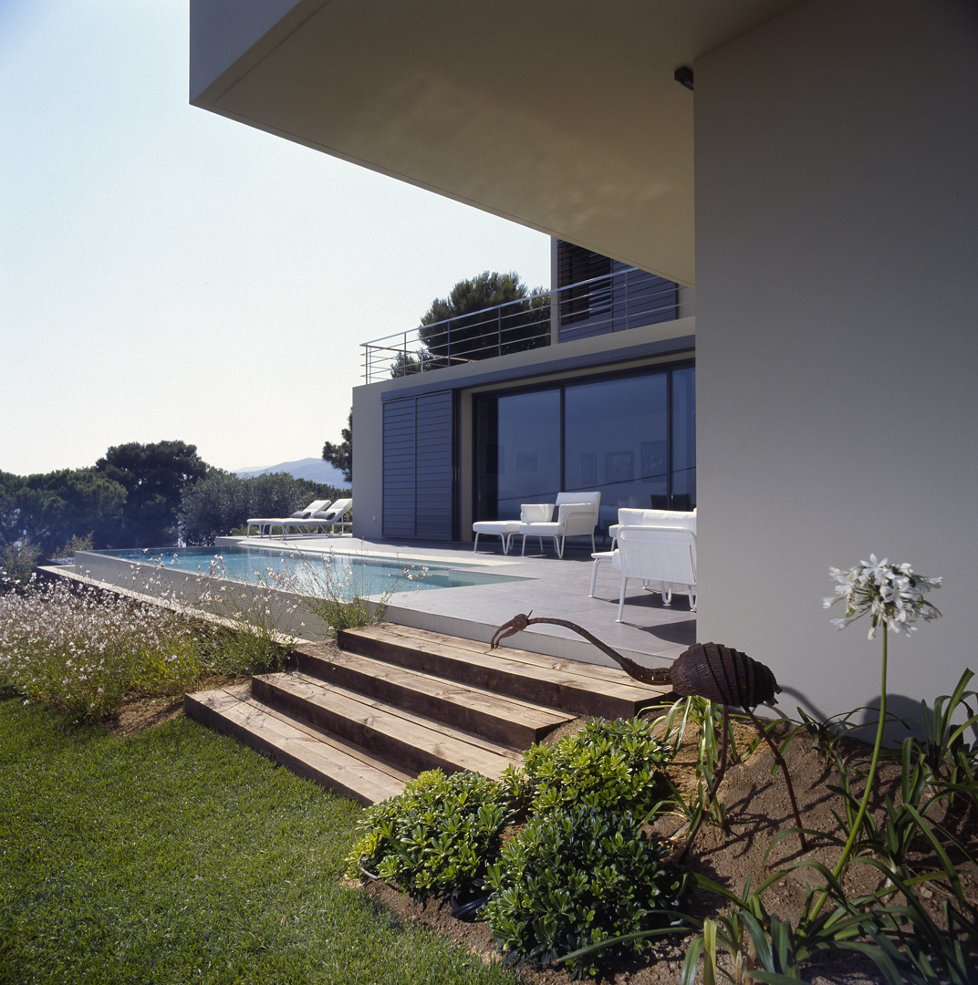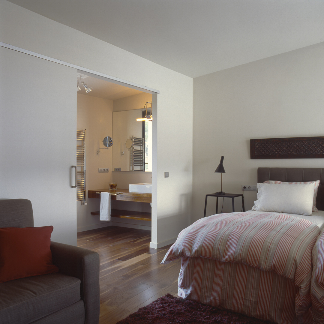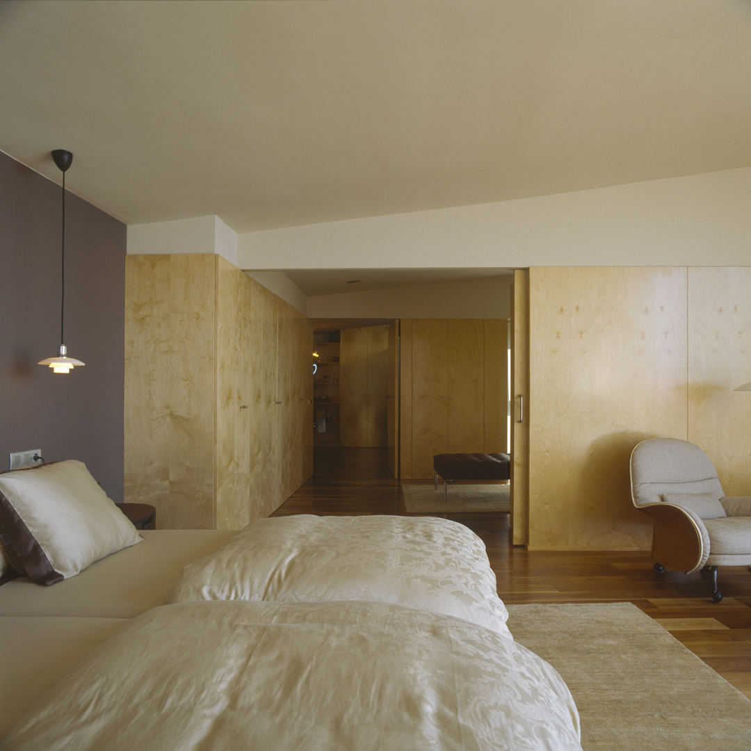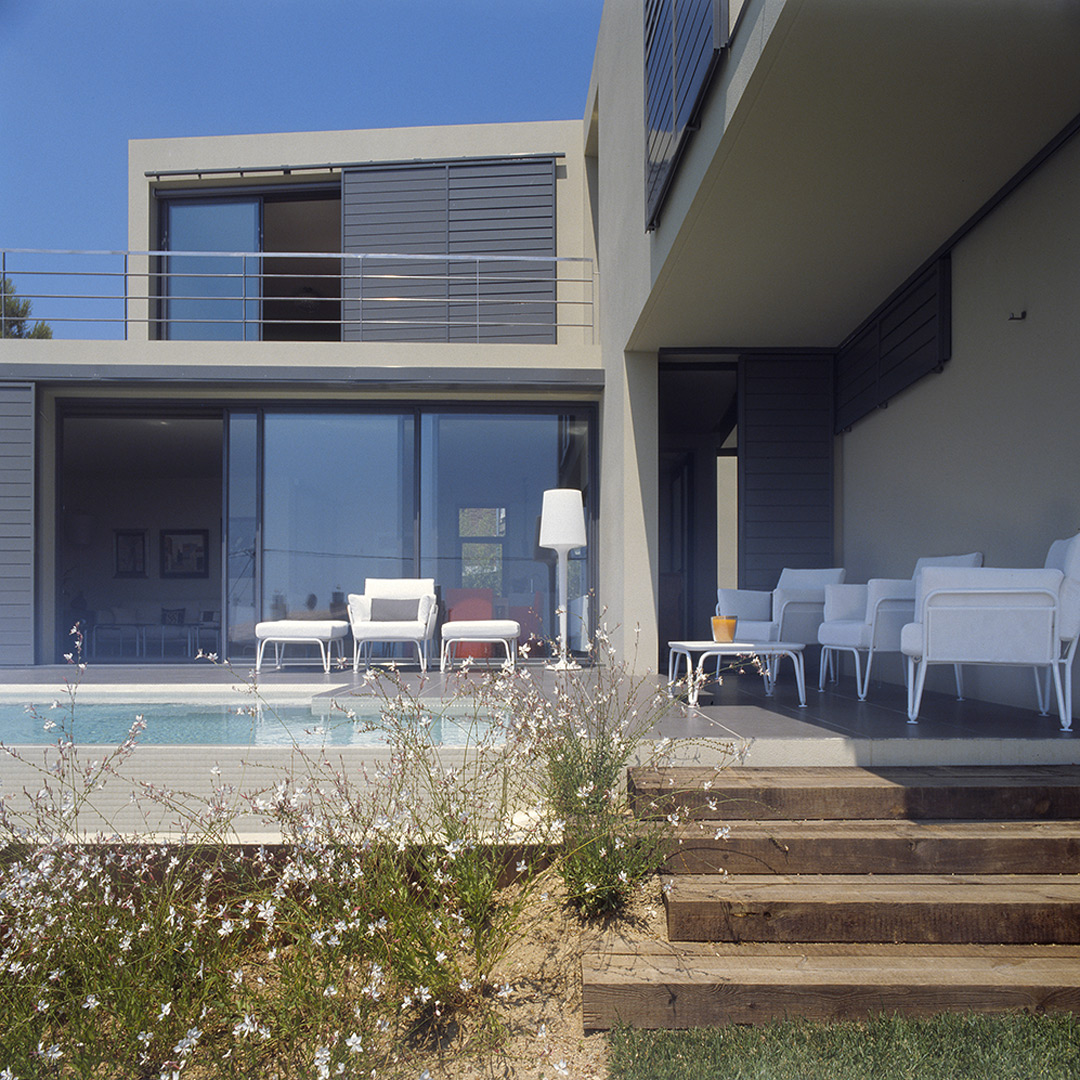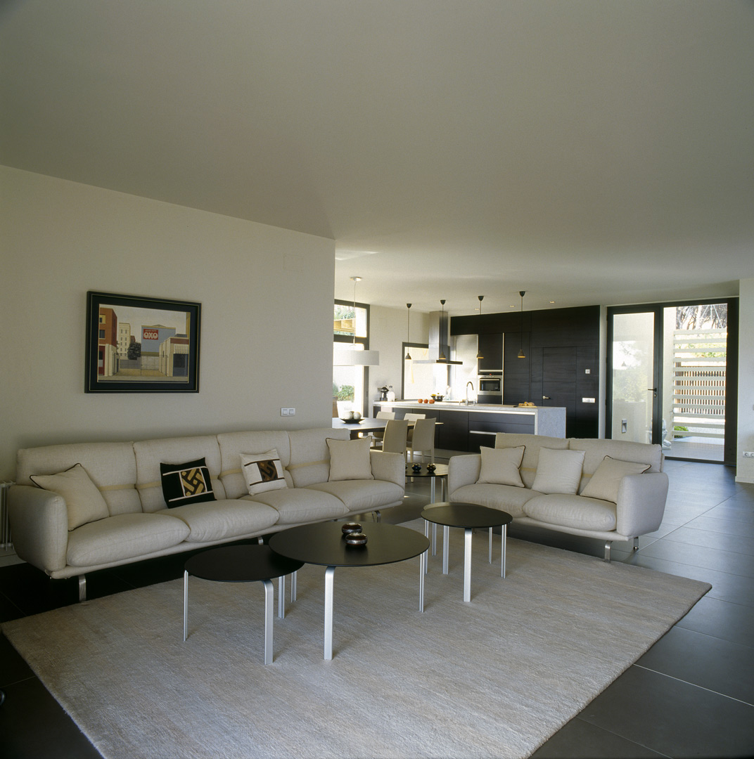 Aunque no lo parezca en principio, este proyecto es una reforma de una vivienda existente. En el momento en que se cursó el permiso, no se otorgaban licencias de obras para viviendas de nueva planta, y el proyecto se tuvo que adaptar a una vivienda existente, de la cual se aprovecharon solamente cuatro muros y todo el volumen del garaje; elemento que estaba fuera de la distancia mínima a vial, y se hubiera tenido que derruir. Todo el proyecto gira sobre el cuerpo donde se encuentra la escalera, y el patio contiguo a este. De ahí, se accede en la planta baja a la zona de día y a la habitación de servicio respectivamente; y en la planta superior a las dos únicas habitaciones, con sus baños respectivos. La zona de día, está compuesta por un salón-comedor con la cocina abierta, con aberturas en sus cuatro fachadas, y un pequeño despensa y lavadero. Mediante grandes aberturas, se aprovechó las vistas privilegiadas sobre el mar, y en planta baja, las continuas conexiones con el exterior.