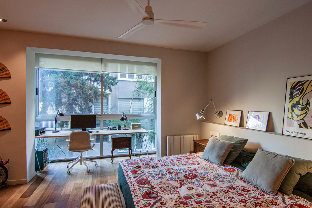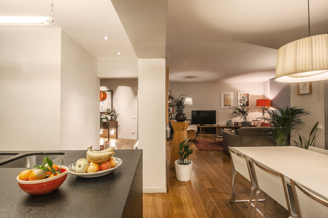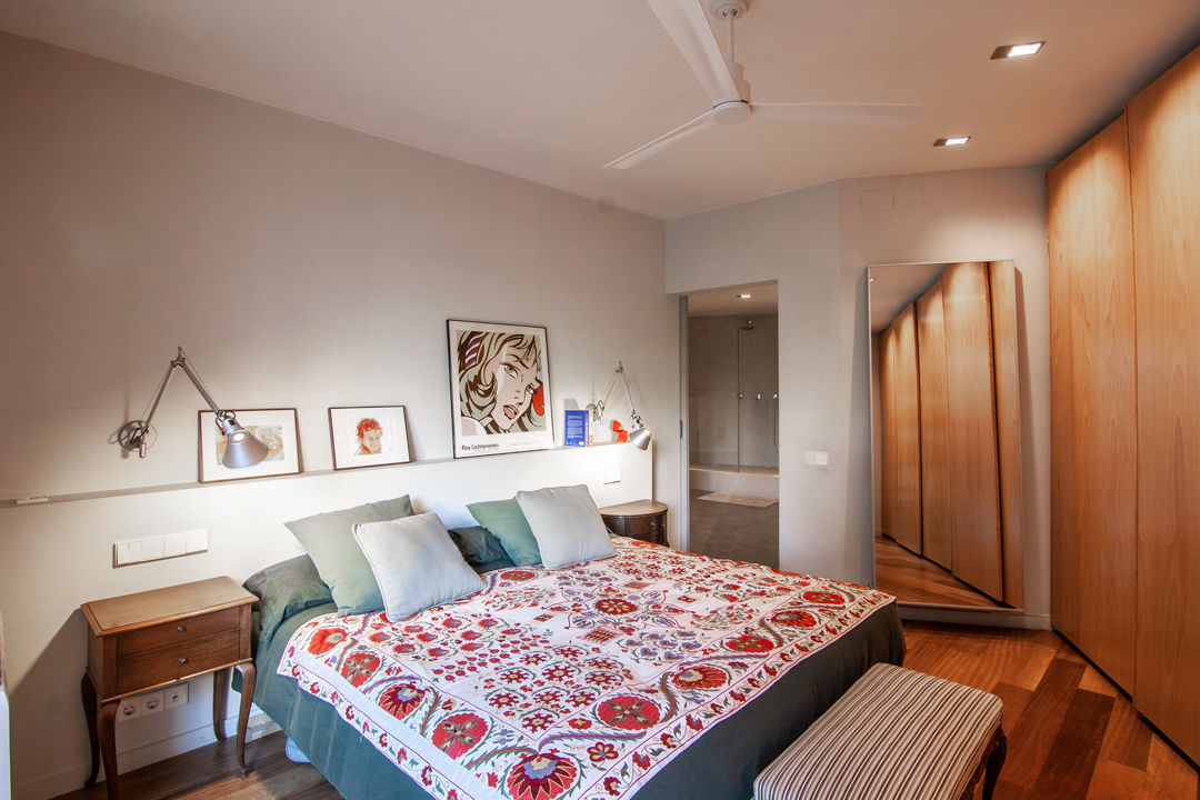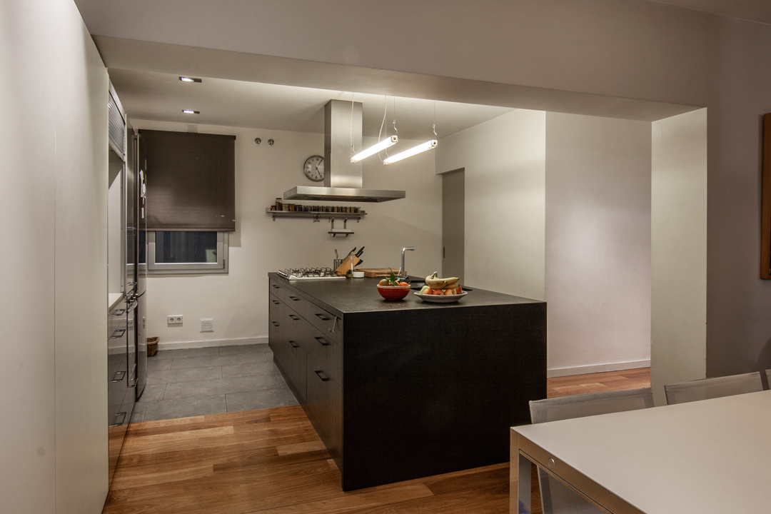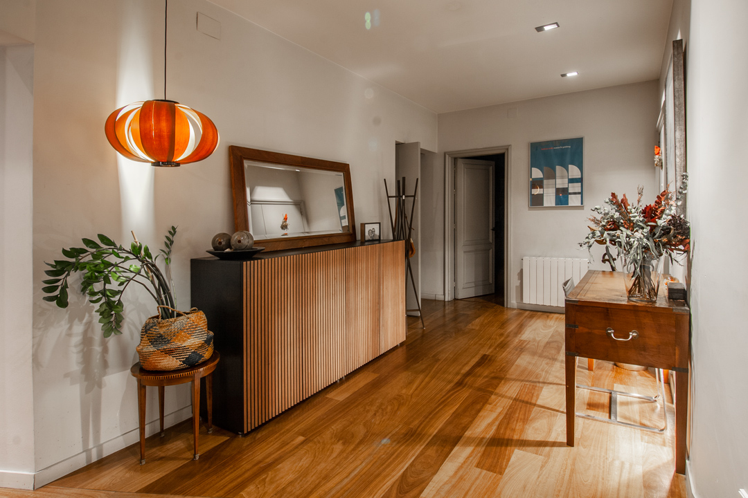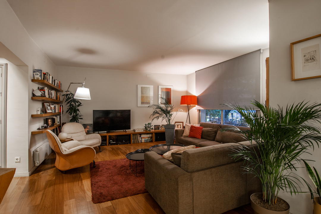 El gran motor del proyecto fue la necesidad de la entrada de la luz, ya que el piso se encuentra en una primera planta. Su fachada principal, orientada a sur, recibe durante todo el día, la luz directa que disfruta la vivienda. La fachada posterior, por el contrario, se vuelca sobre un interior de manzana ajardinada, pero sin recibir ni un rayo de luz directa. En esta dirección se decidió apear parte del muro que divide la cocina del comedor, y desmontar la puerta que dividía salón del recibidor, incorporándolo, ya que se trataba de una pieza excesivamente grande. En las habitaciones, se acristalaron los huecos de ventanas, que tenían antepechos opacos, y se sacaron las lamas de la balconera de la habitación principal. De los tres baños que había, se reestructuraron en dos, de grandes dimensiones, y con bañera incorporada.