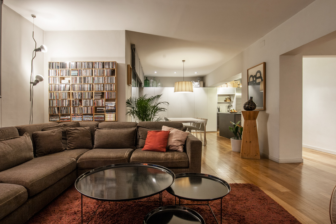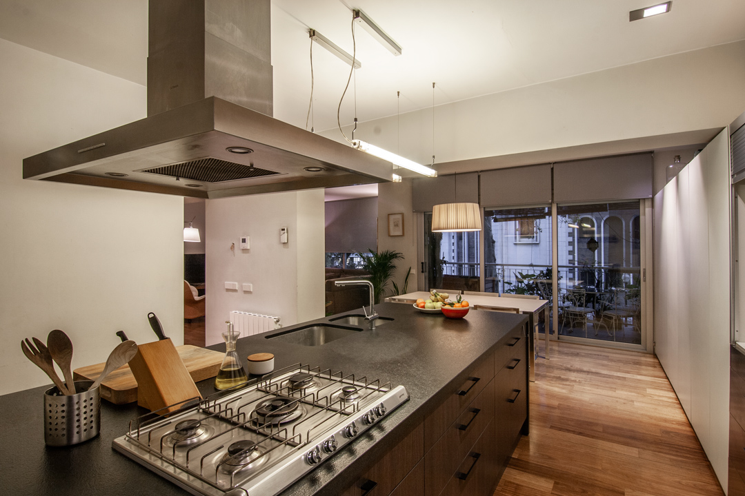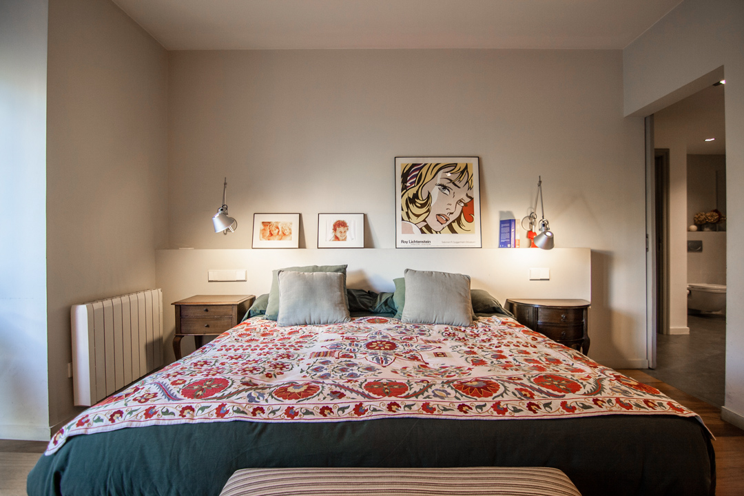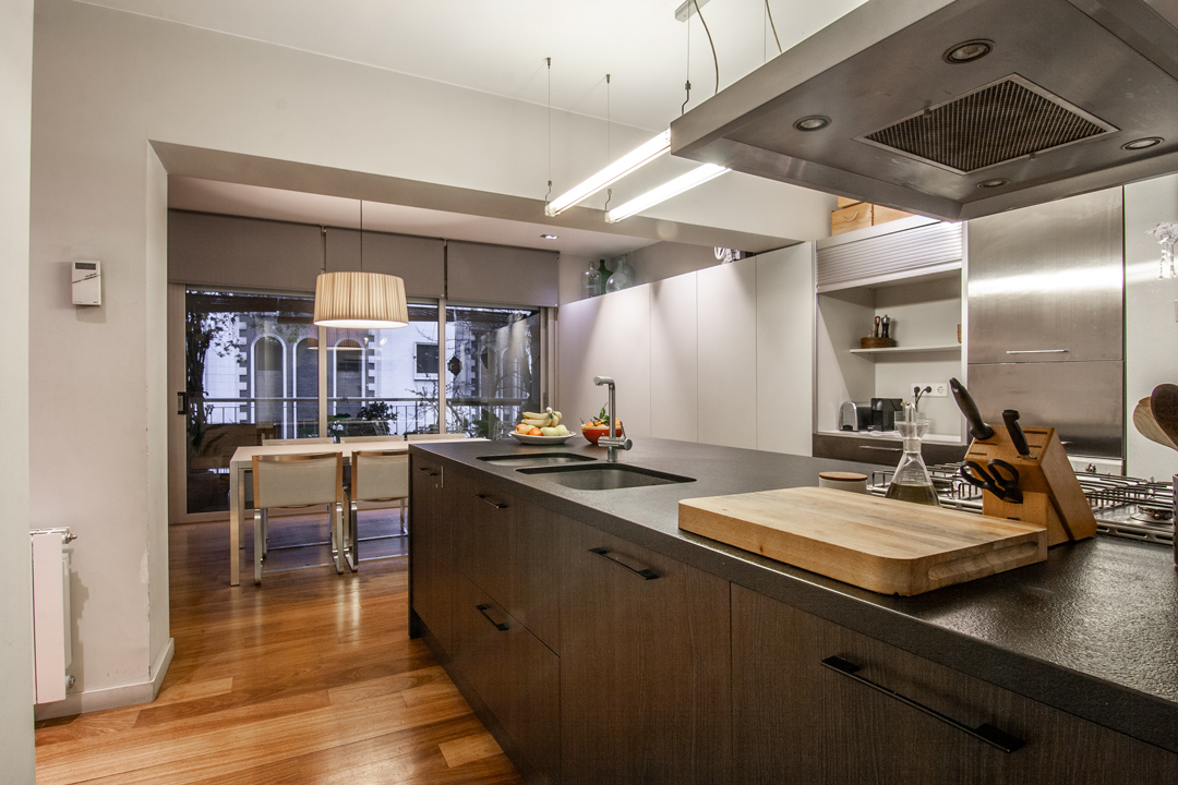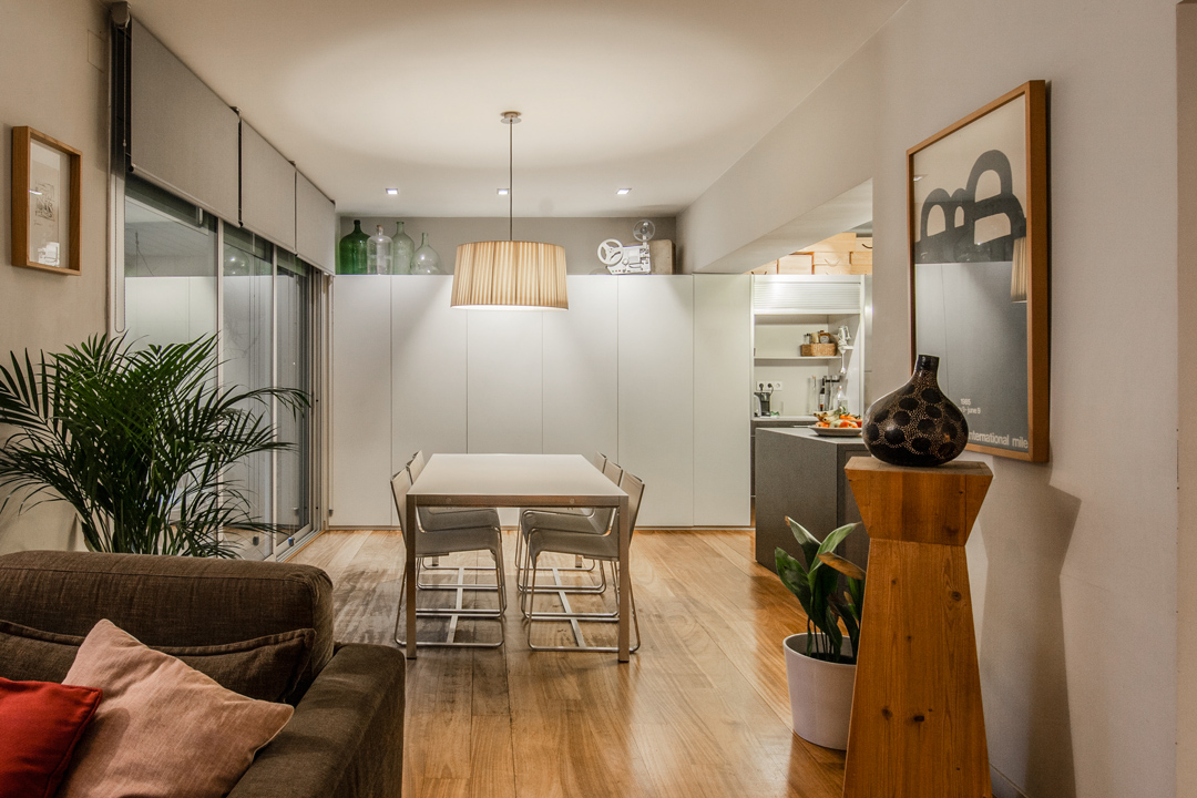 El gran motor del proyecto fue la necesidad de la entrada de la luz, ya que el piso se encuentra en una primera planta. Su fachada principal, orientada a sur, recibe durante todo el día, la luz directa que disfruta la vivienda. La fachada posterior, por el contrario, se vuelca sobre un interior de manzana ajardinada, pero sin recibir ni un rayo de luz directa. En esta dirección se decidió apear parte del muro que divide la cocina del comedor, y desmontar la puerta que dividía salón del recibidor, incorporándolo, ya que se trataba de una pieza excesivamente grande. En las habitaciones, se acristalaron los huecos de ventanas, que tenían antepechos opacos, y se sacaron las lamas de la balconera de la habitación principal. De los tres baños que había, se reestructuraron en dos, de grandes dimensiones, y con bañera incorporada.