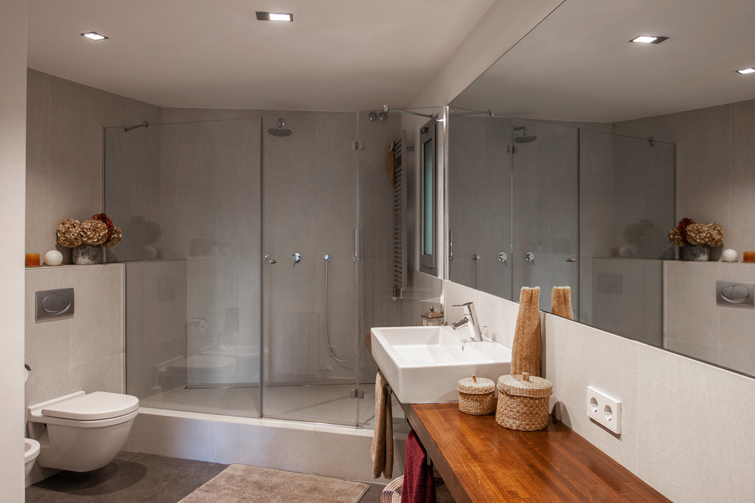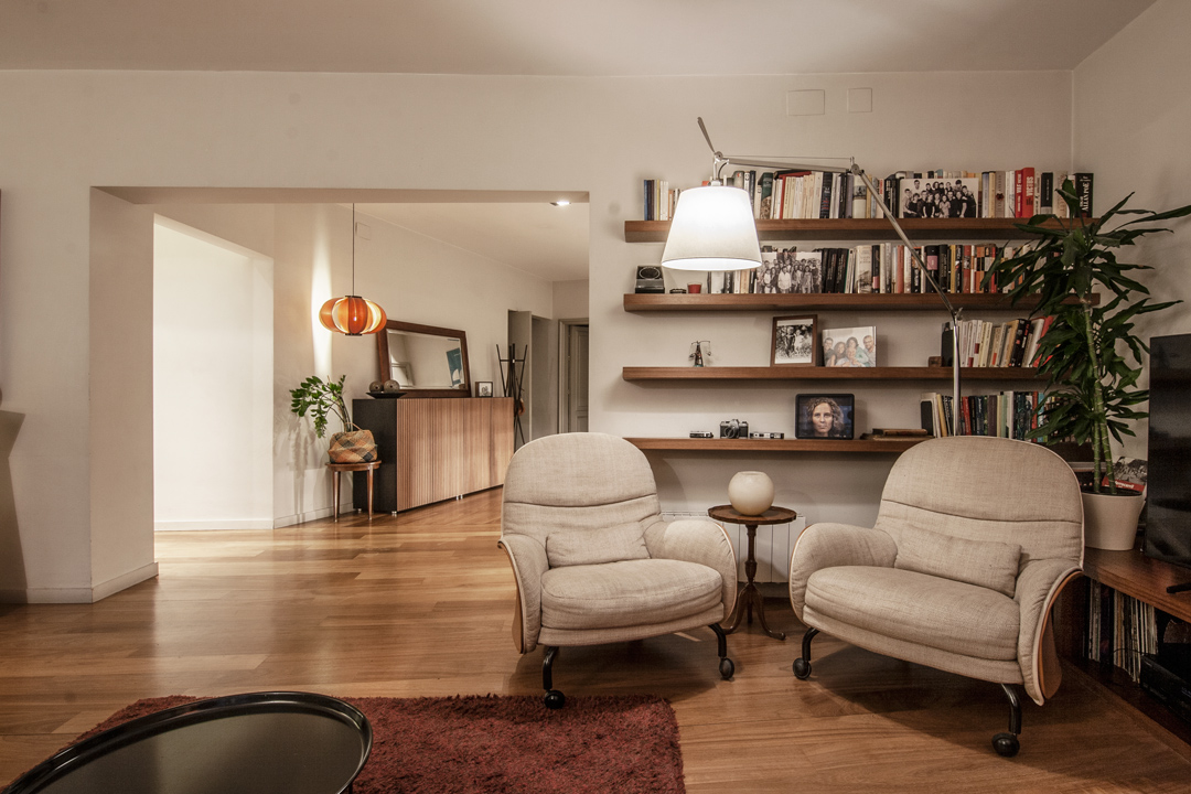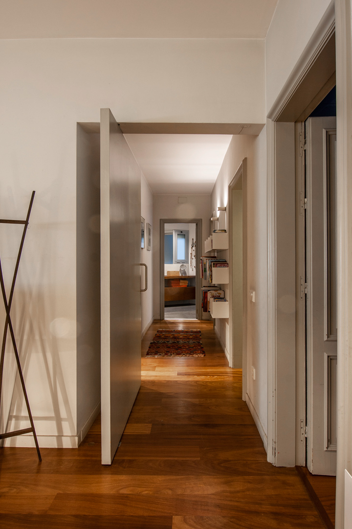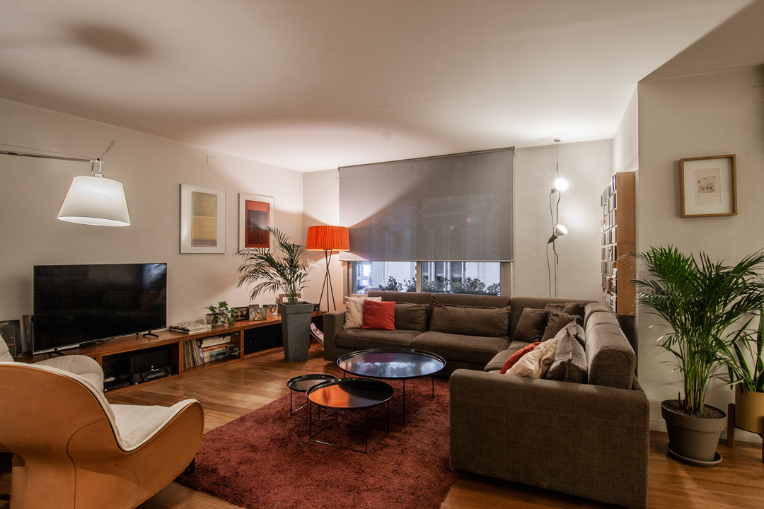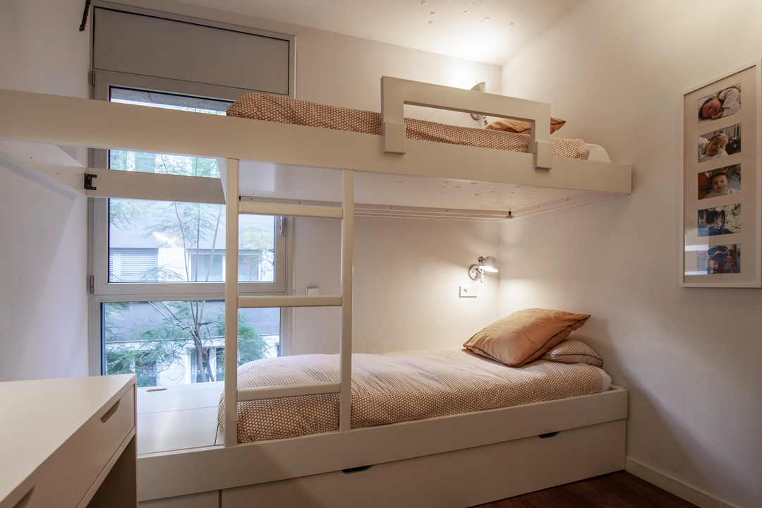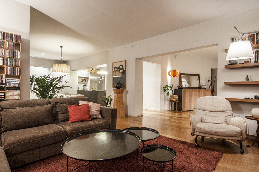 El gran motor del proyecto fue la necesidad de la entrada de la luz, ya que el piso se encuentra en una primera planta. Su fachada principal, orientada a sur, recibe durante todo el día, la luz directa que disfruta la vivienda. La fachada posterior, por el contrario, se vuelca sobre un interior de manzana ajardinada, pero sin recibir ni un rayo de luz directa. En esta dirección se decidió apear parte del muro que divide la cocina del comedor, y desmontar la puerta que dividía salón del recibidor, incorporándolo, ya que se trataba de una pieza excesivamente grande. En las habitaciones, se acristalaron los huecos de ventanas, que tenían antepechos opacos, y se sacaron las lamas de la balconera de la habitación principal. De los tres baños que había, se reestructuraron en dos, de grandes dimensiones, y con bañera incorporada.